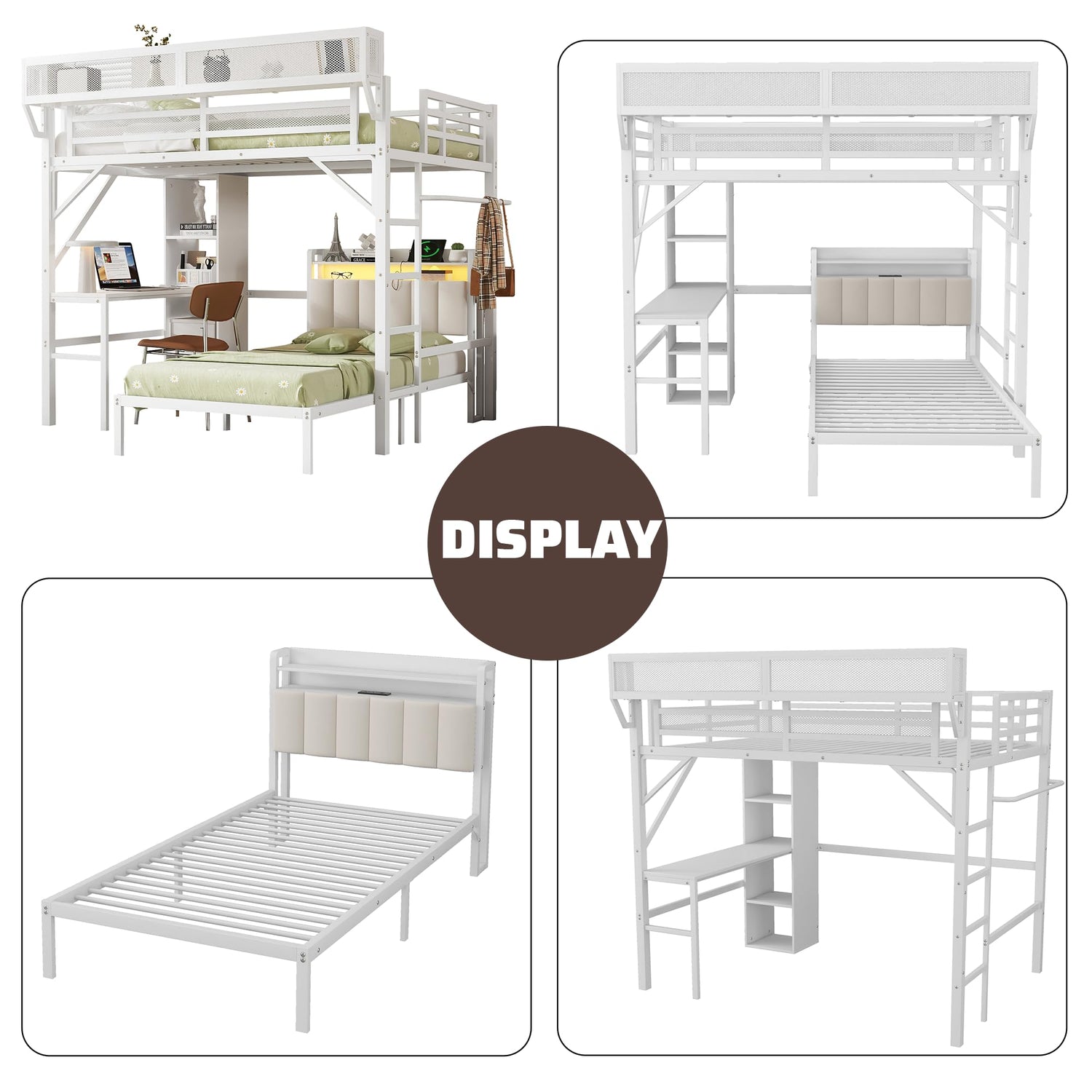 Details: Full over Twin Bunk Bed with Desk and Bookshelves, Detachable Metal Bunk Bed with LED and Charge Station