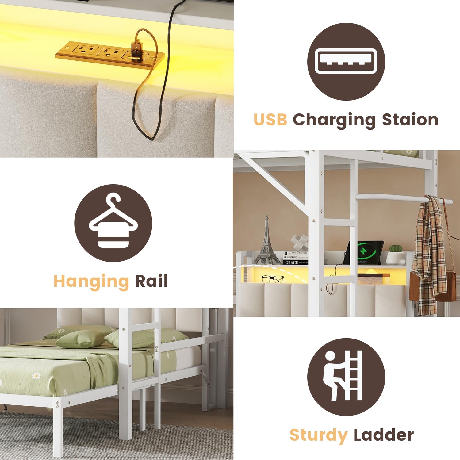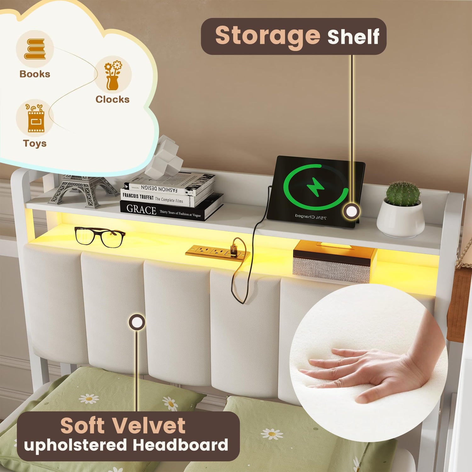 • 【RGB Lighting & Comfortable Headboard】Customize your space with built-in RGB LED lighting featuring 60,000+ color options, controllable via remote or mobile app. The soft-padded velvet headboard offers comfortable support for reading or relaxing, while also including a handy storage shelf. Perfect for late-night studying or creating a calming ambiance, this full over twin bunk bed with desk blends modern style with practical comfort.