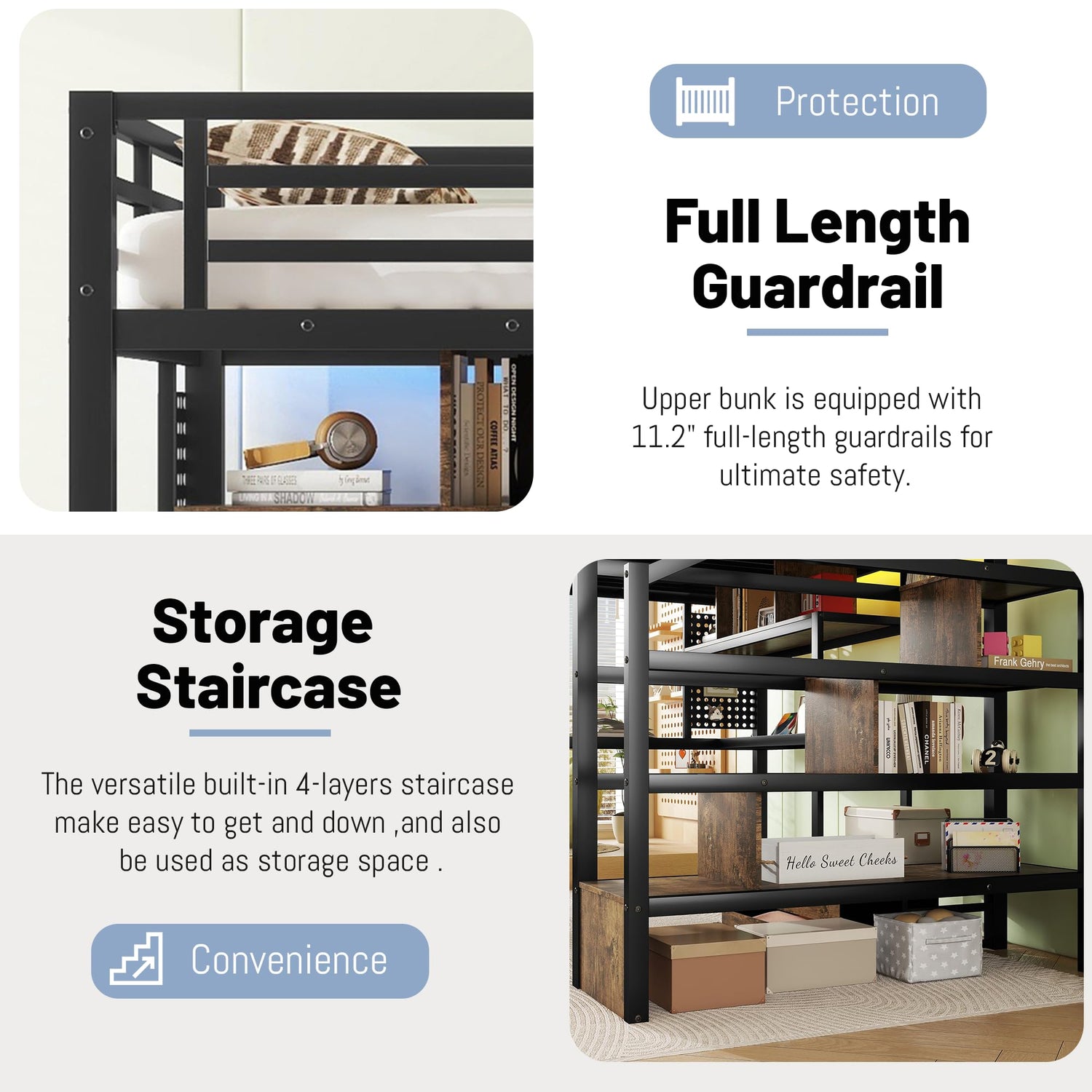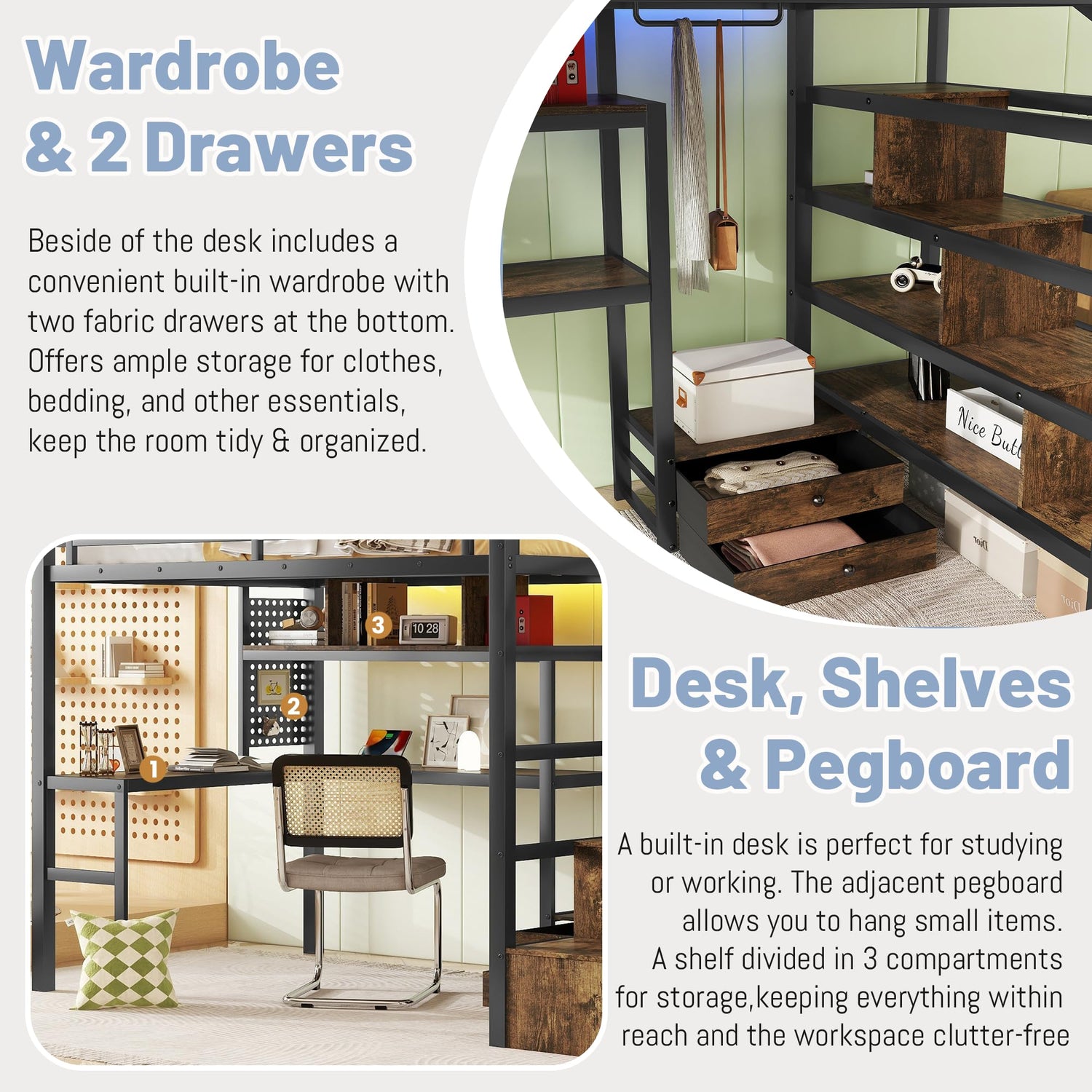MoproBeti Full Size Loft Bed with Desk and Stairs,Metal Gaming Loft Bed with LED,Charging Station, High Loft Bed Full with Storage Shelves,Wardrobe and Drawers for Kids Teens, Adults, Black