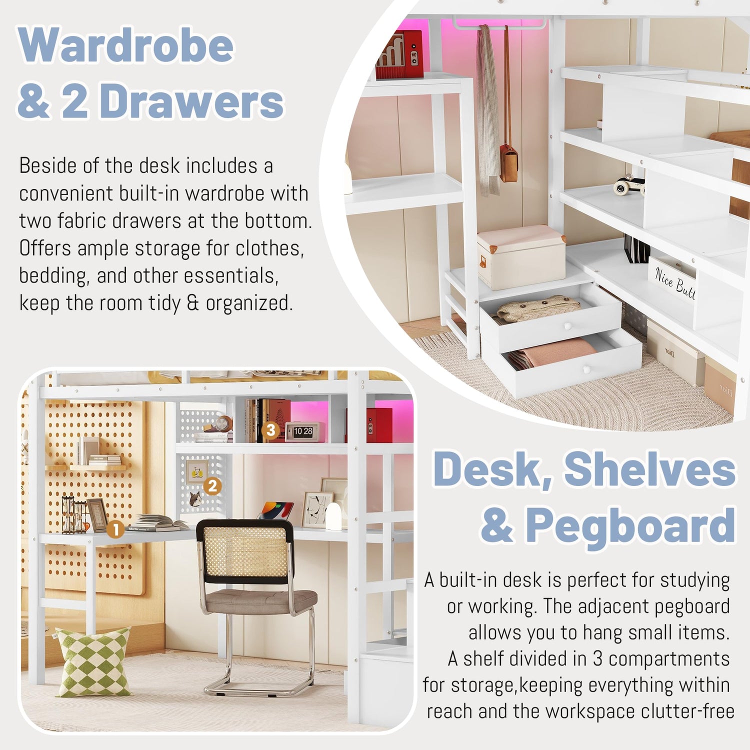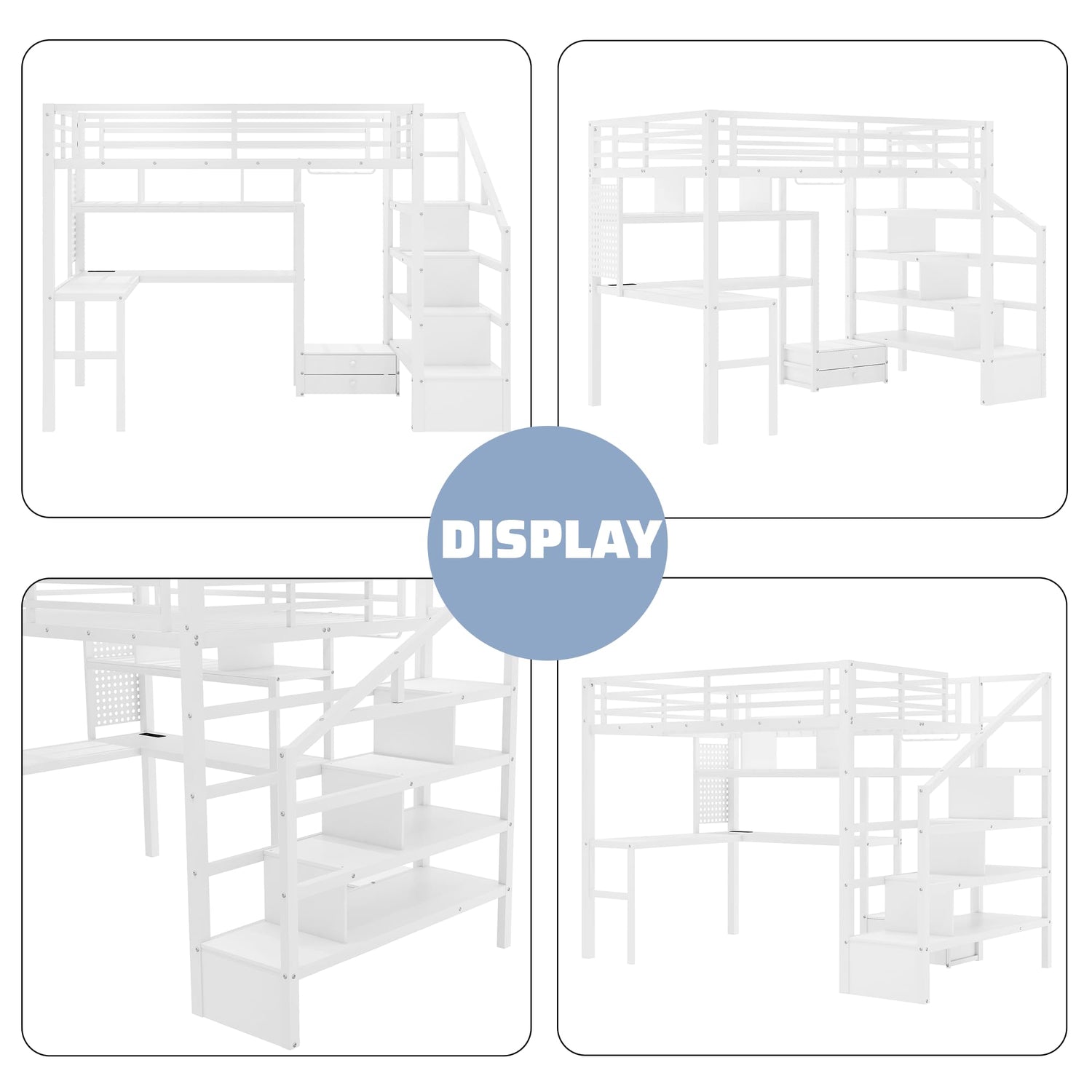 - 【Full Loft Bed with Desk and Open Shelves】Maximize your living space with this full size loft bed featuring a built-in desk ,adjacent pegboard and open storage shelves. Ideal for small rooms, this loft bed with desk full size allows you to efficiently store your essentials while creating a productive study or office area, perfect for adults and kids alike.