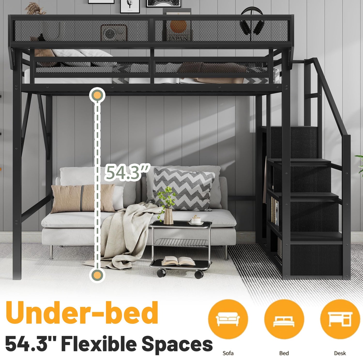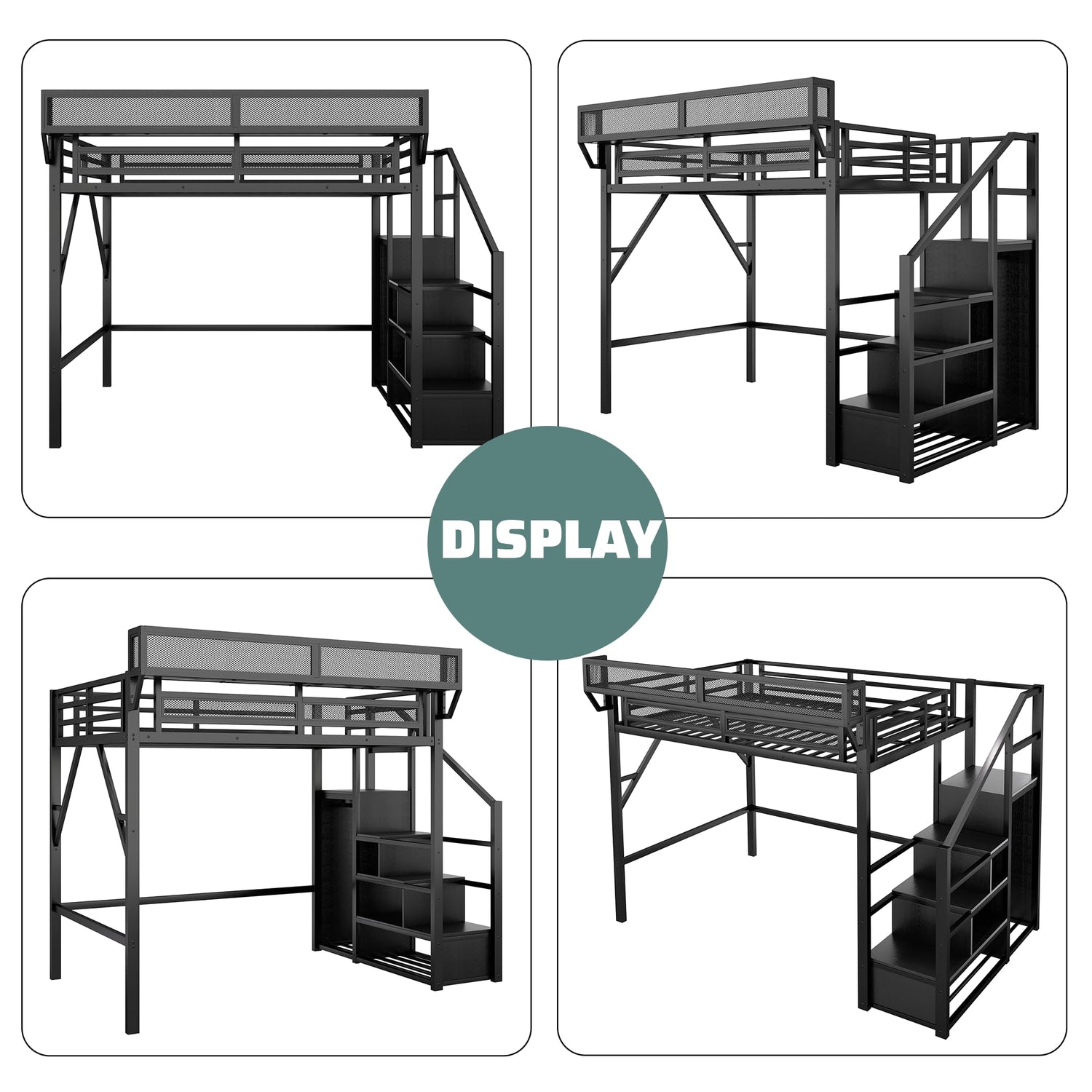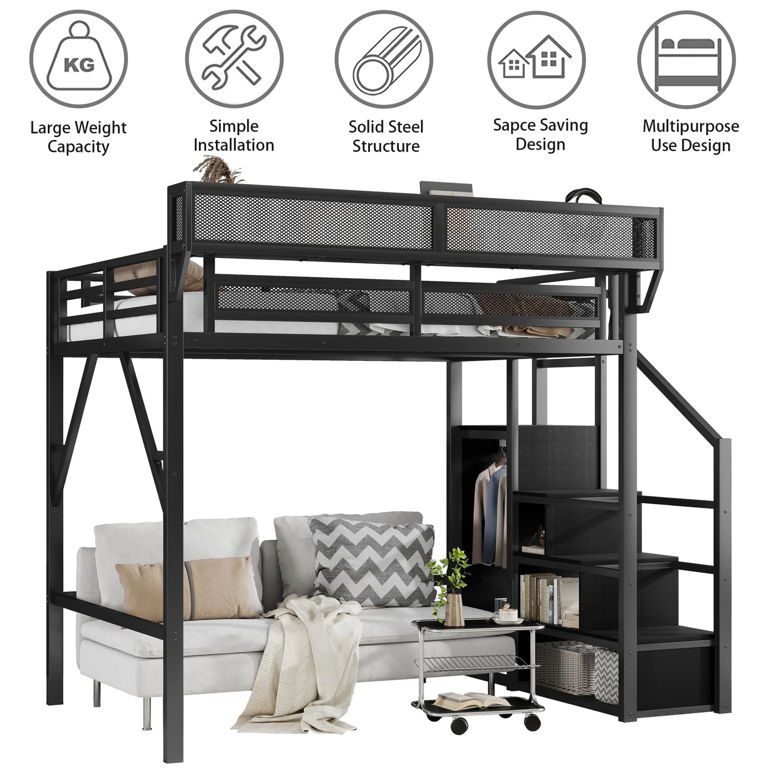 - 【Heavy-Duty Metal Loft Bed Frame】 This full loft bed with stairs constructed with heavy duty metal.It's securely strong and stable.Full-length guardrail and secured heavy-duty metal slats for added security.and the sturdy built-in staircase makes it easy for child to climb up and down.