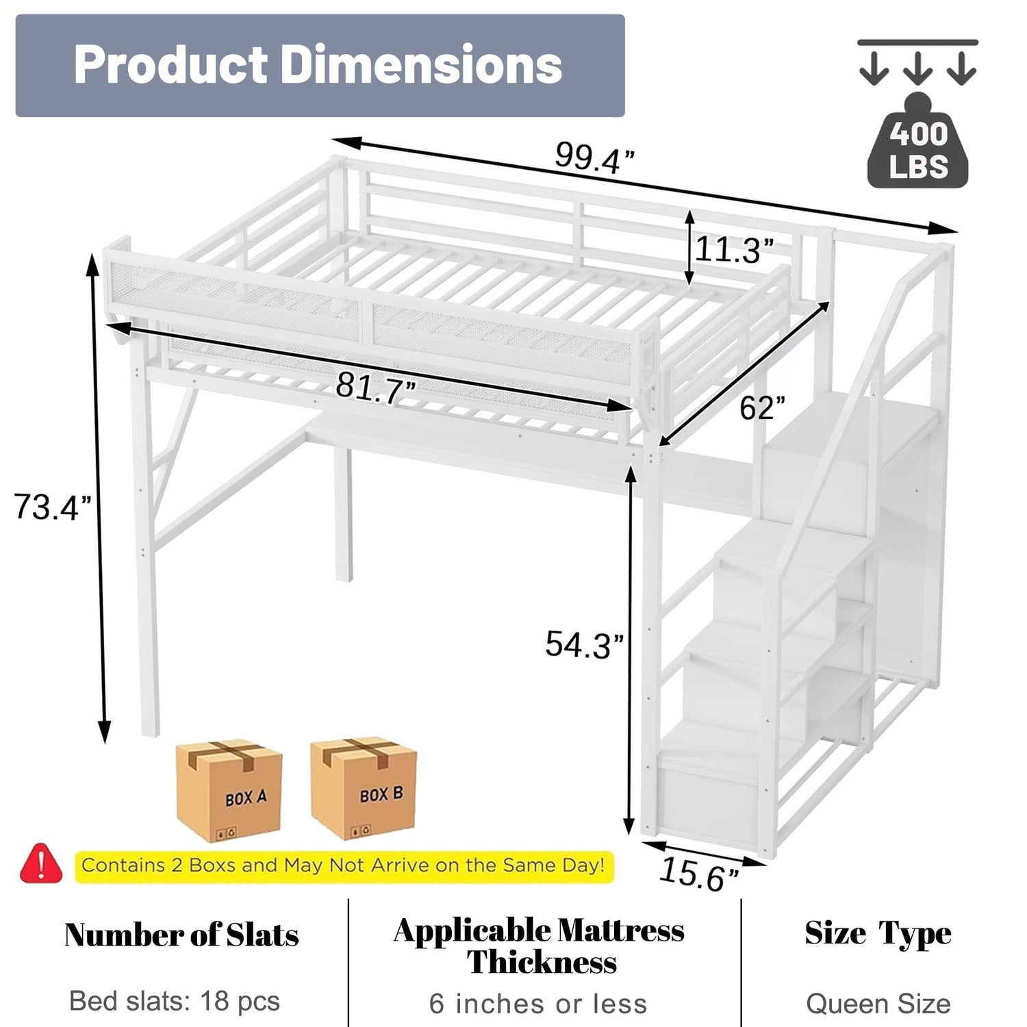 - 【Heavy-Duty Metal Queen Loft Bed Frame】 This queen size loft bed with desk constructed with reinforced steel for stability.It's securely strong and stable.Full-length guardrail and secured heavy-duty metal slats for added security.while the built-in staircase makes it easy for child to climb up and down.