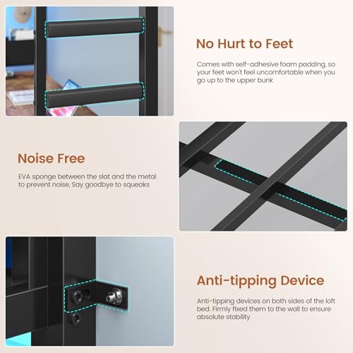 - Comfortable & Safe Upper Bunk: Comfort and safety are the core considerations for this loft bed. The upper bunk is fully surrounded by a sturdy 11.8-inch high guardrail, combined with anti-tipping devices on both sides, creating double protection for enhanced stability. A mattress height of 4-6 inches is recommended to allow the guardrail to provide effective protection. The ladder is padded to prevent foot discomfort, making getting in and out of bed quiet and comfortable