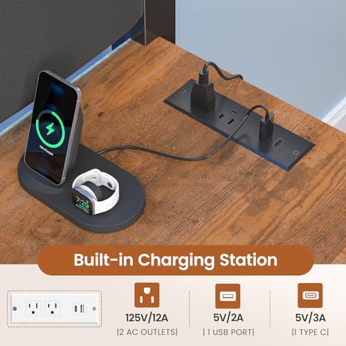 - Charging Station & LED Lighting: A built-in power strip at the corner of the desk includes 2 standard sockets, 1 USB port, and 1 Type-C port. This allows for convenient charging of computers, mobile phones, and other electronic devices. Above the metal mesh is an RGB LED light strip with over 60,000 colors to choose from, featuring multiple dynamic modes and the ability to dynamically synchronize with music, creating a vibrant atmosphere for your bedroom