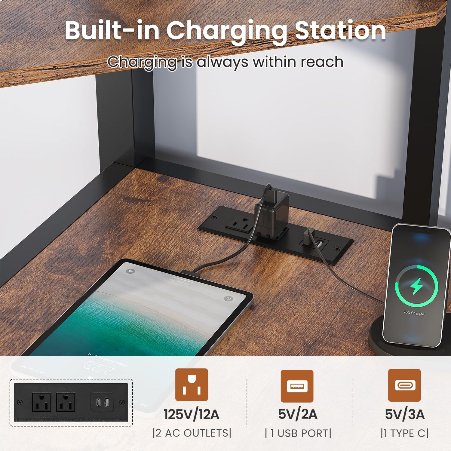 - [Loft Bed with L-Shaped Desk and Charging Station] This loft bed makes full use of space. Comes with an L-shaped desk to create an area for study and leisure. Built-in charging station, including 2 AC outlets, 1 USB port and 1 TYPE-C. It simplifies device charging and is convenient for charging your computer, mobile phone and other devices