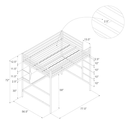 This loft bed is available in both twin and full sizes and comes in various colour options to match your décor preferences. With product dimensions of 77.5" L x 56.5" W x 72" H and an under-bed clearance of 58", it’s designed to make the most of your space.