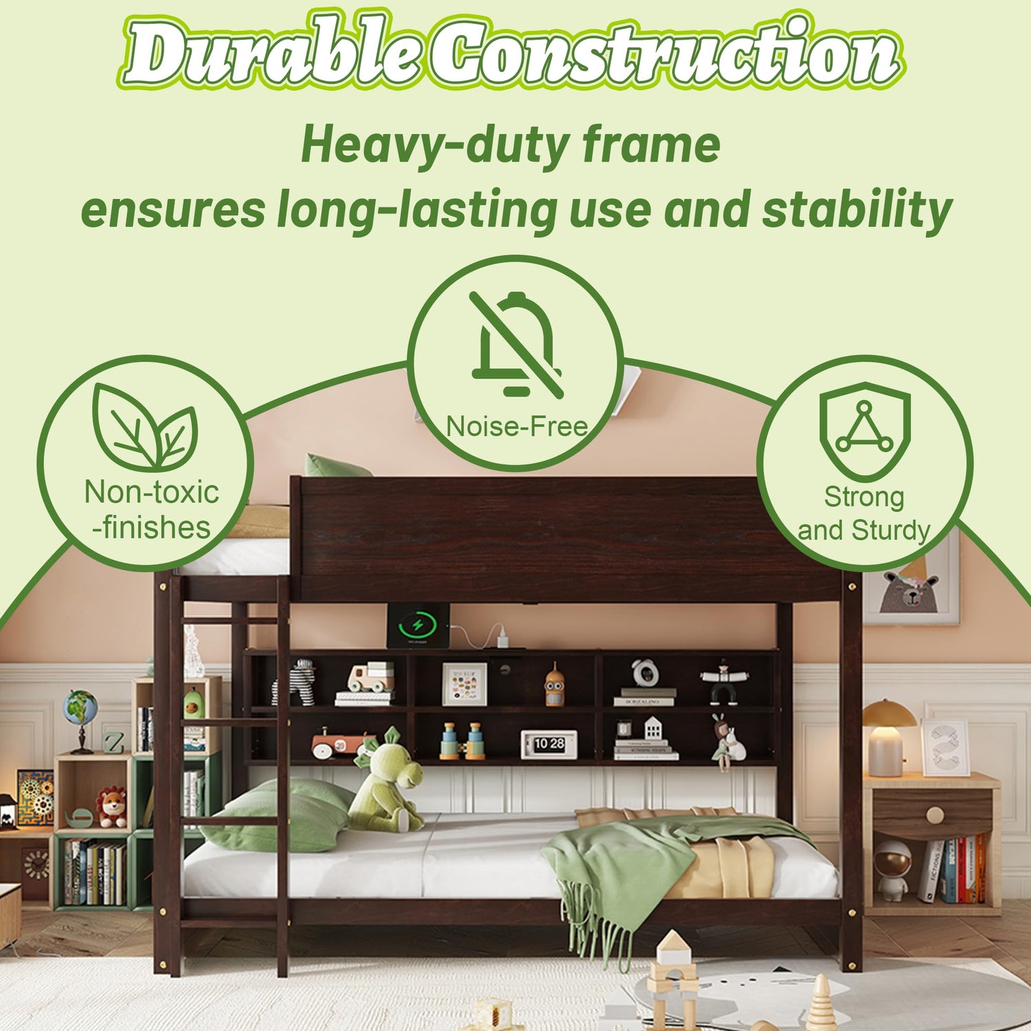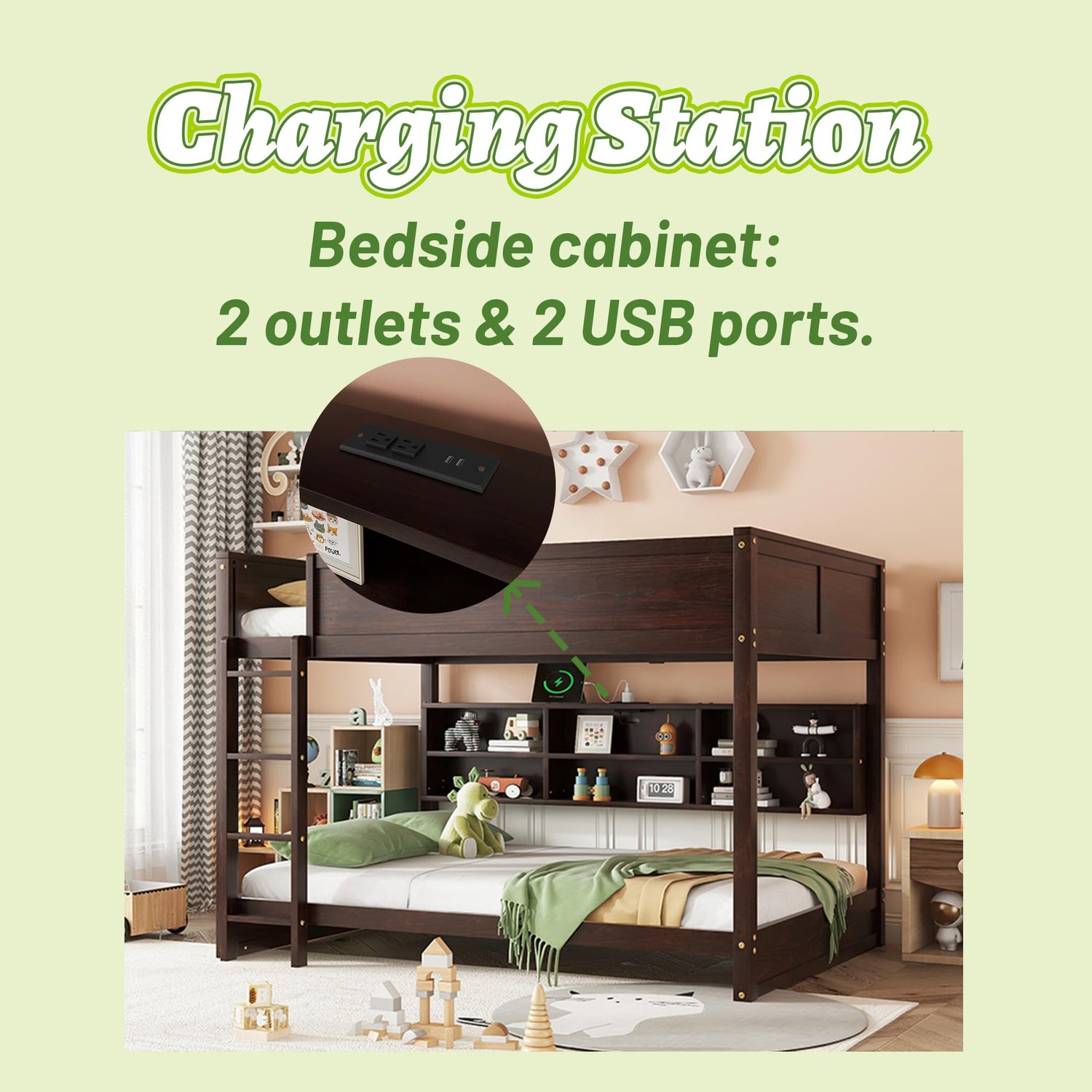 OYUMOENTS Queen Over Queen Bunk Bed, Solid Pine Wood Bunk Bed with Built-in Storage Cabinets, Charging Station, Ladder,Safety Guardrails, No squeaking for Teens & Adults, Brwon