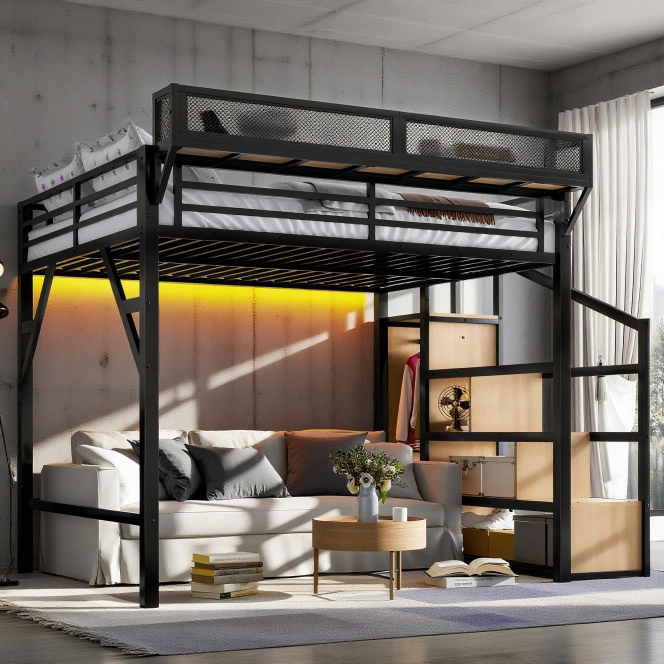 Details: Upgrade your bedroom with this all-in-one Queen Loft Bed with Storage and Built-in Features, designed to maximize space while offering convenience, safety, and style. Ideal for teens, students, or anyone in need of vertical storage, this space-saving loft bed turns your sleeping area into a multifunctional living solution.Built with a durable metal frame, this loft bed features a smart layout that includes storage stairs, open shelves, and a built-in wardrobe — perfect for organizing clothes, books, toys, and essentials without taking up extra room. It’s a complete storage solution built right into your bed.Designed for modern living, the bed comes equipped with USB charging ports and LED strip lighting, making it easy to charge your devices or read at night without needing extra furniture or cords. Convenience and style come together in one streamlined setup.