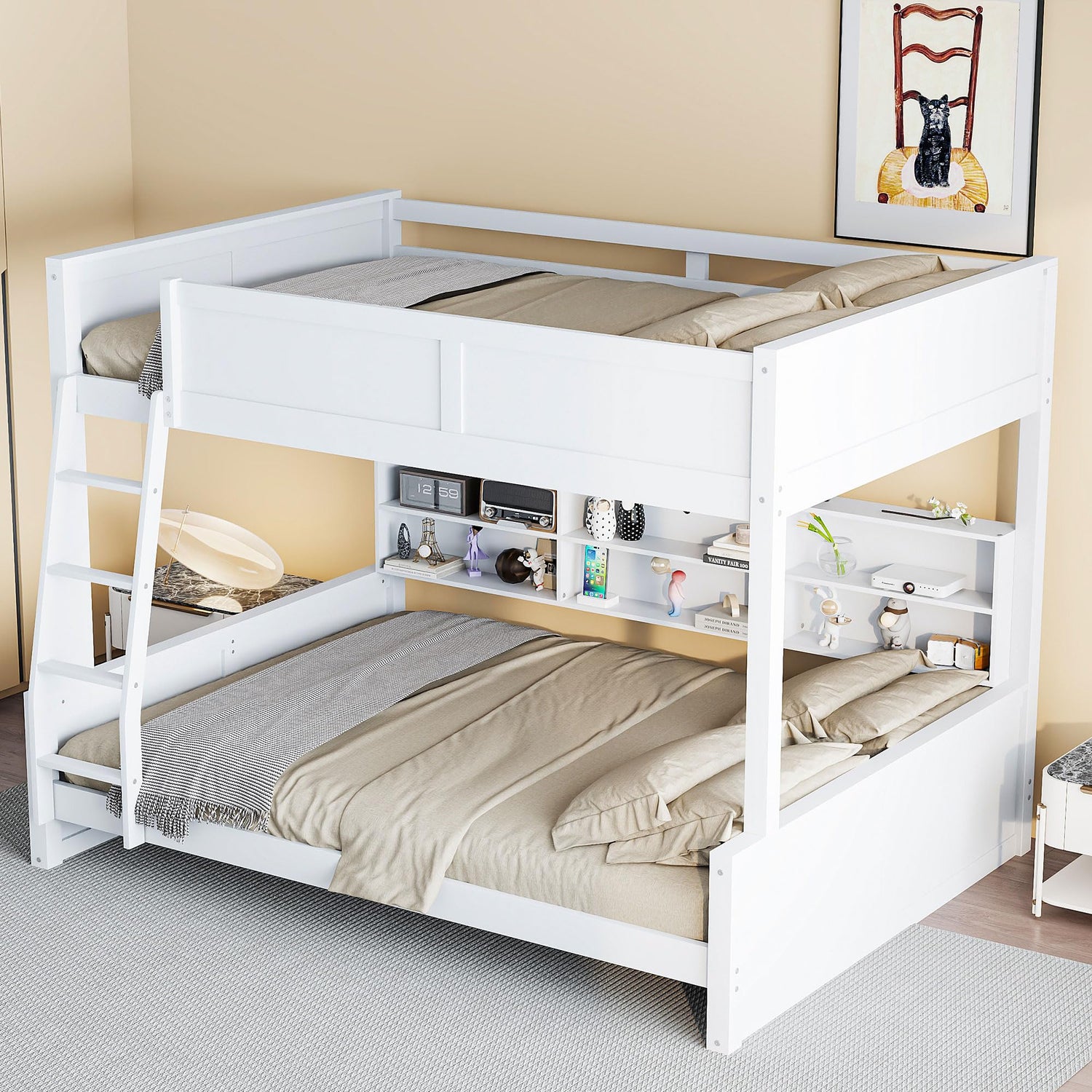 - [Space-Saving Bunk Bed]: This modern bunk bed has a timeless shape and color scheme that seamlessly blends into a variety of decoration styles. It provides a comfortable resting area while also having convenient storage and charging functions to make full use of space.