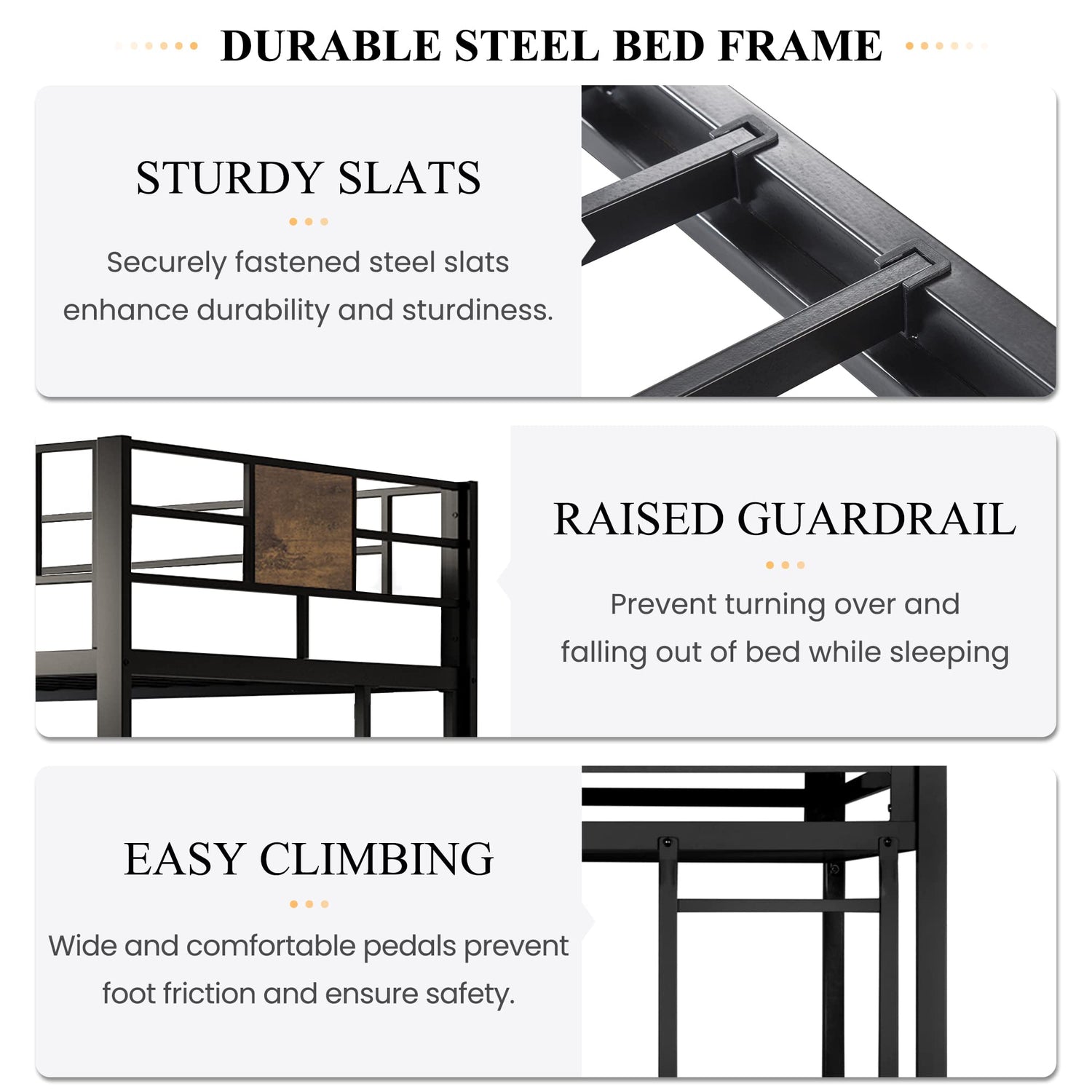 SHA CERLIN Black Metal Twin Loft Bed Frame with Stairs and Full-Length Guardrail