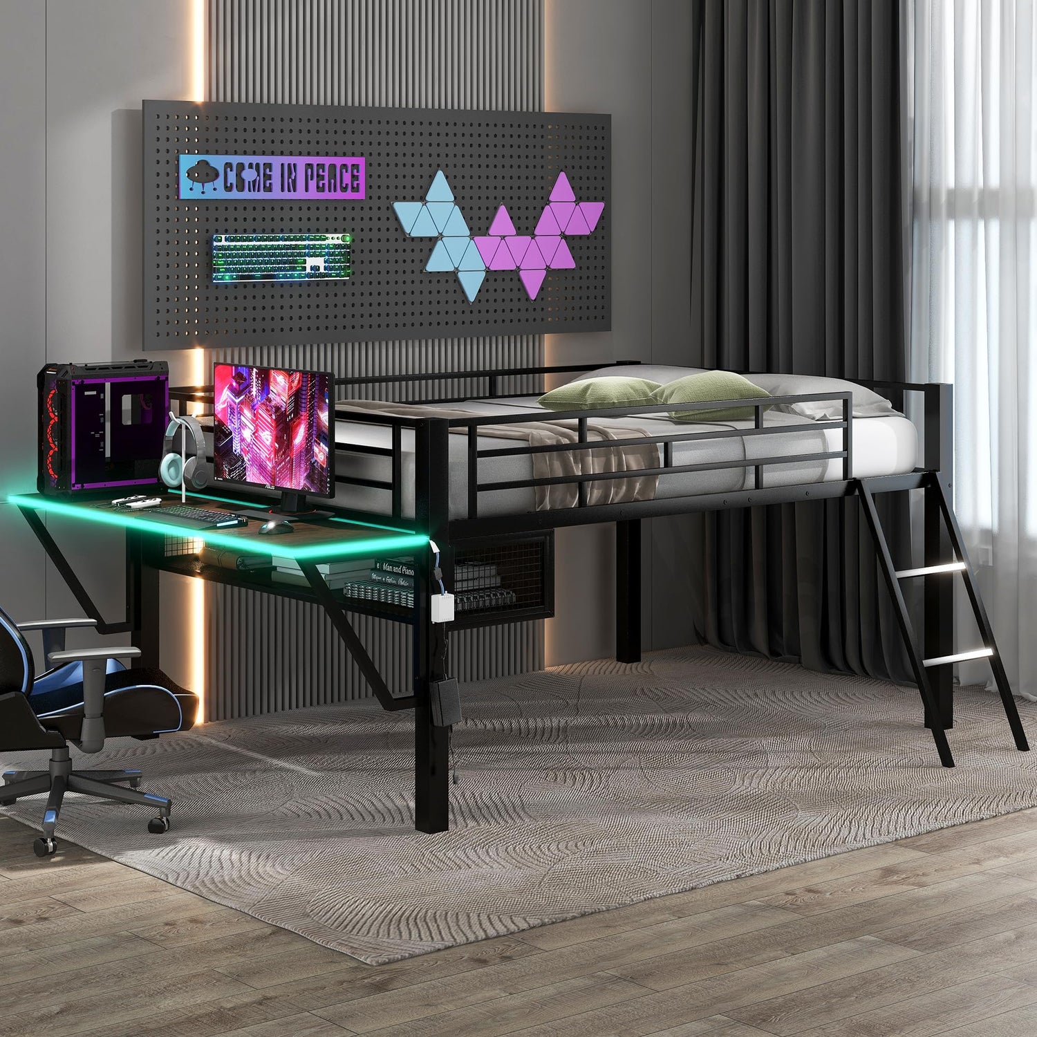 Craft your ultimate gaming den with this elevated sleeping solution, which features an integrated desk platform and vented mesh undercarriage storage for consoles and game accessories. The loft bed is raised on a sturdy steel platform, providing ample under-bed space for toys, extra furniture, or gaming chairs.