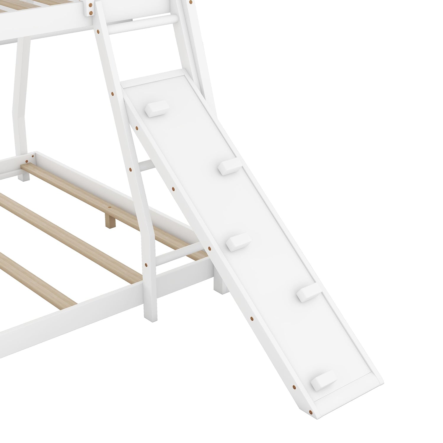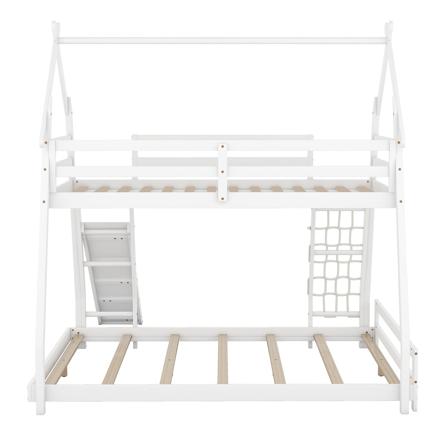 SOFTSEA Twin Over Queen Bunk Bed with Climbing Nets and Ramp in Whitewash