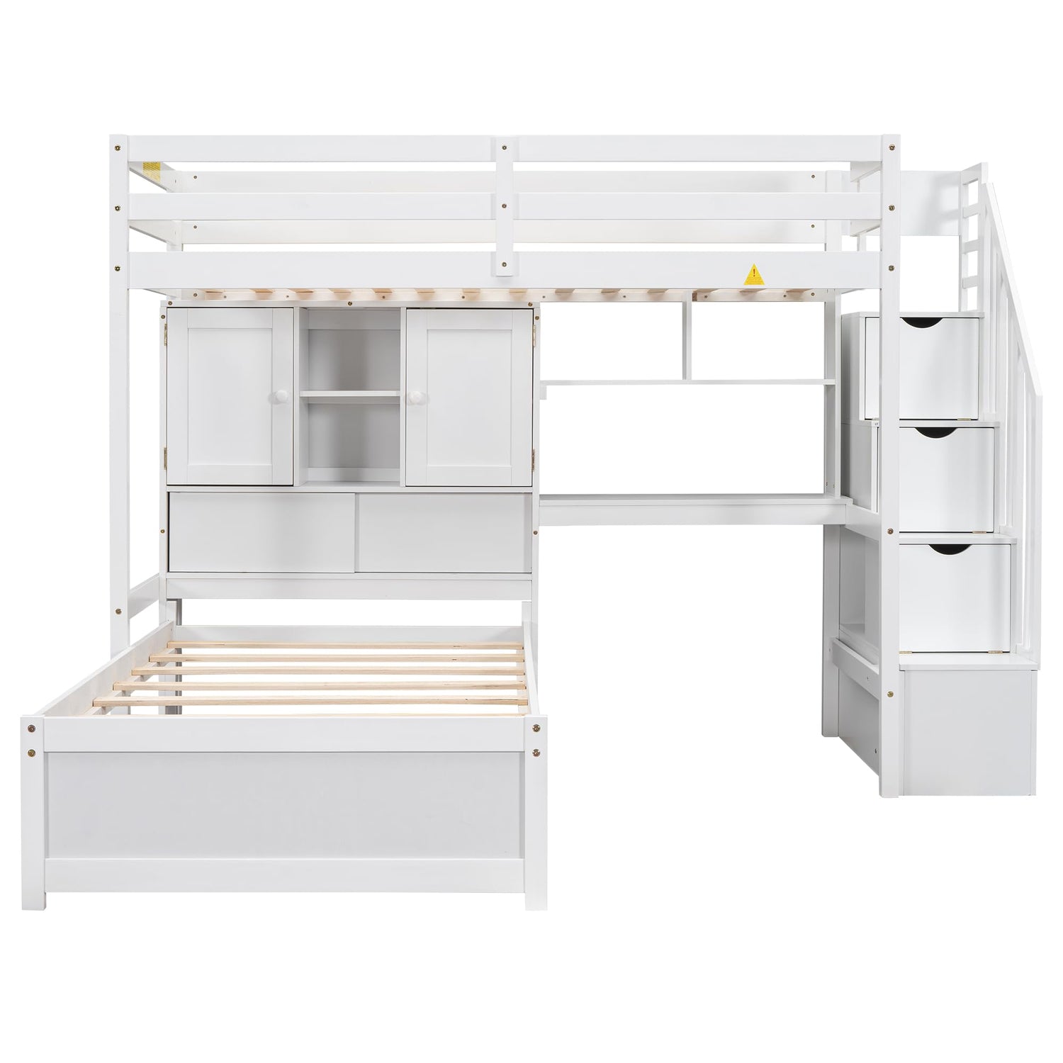 Coming with twin over twin loft bed features one twin size loft bed with Staircase and one twin size platform bed with storage space. Utilizing every space within the bed's structure, a fully assembled shelves and built-in desk are built into the side to give you tons of storage opportunity.