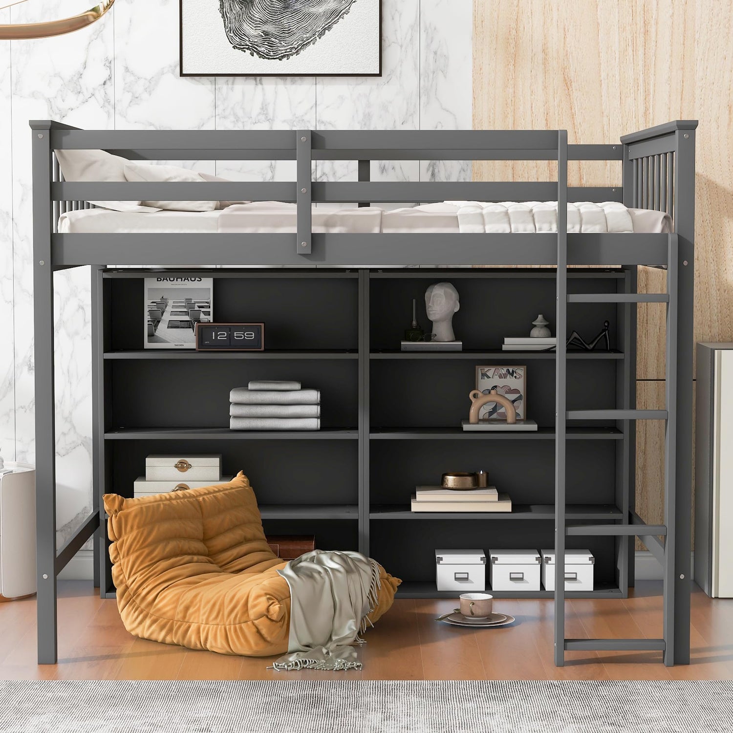 SOFTSEA Twin Size Grey Loft Bed with Open Storage and Ladder for Kids