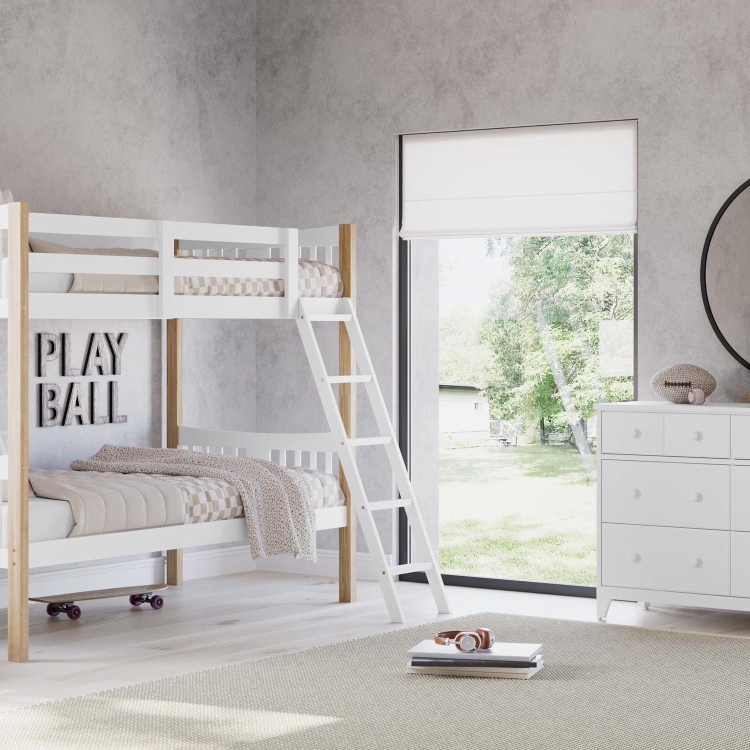 - QUALITY CRAFTMANSHIP: Crafted of rubberwood solids, engineered wood, and wood composites; Includes fixed 5-step ladder and full-length safety guardrails for top bunk; Top bunk not to be used by children under 6 years of age