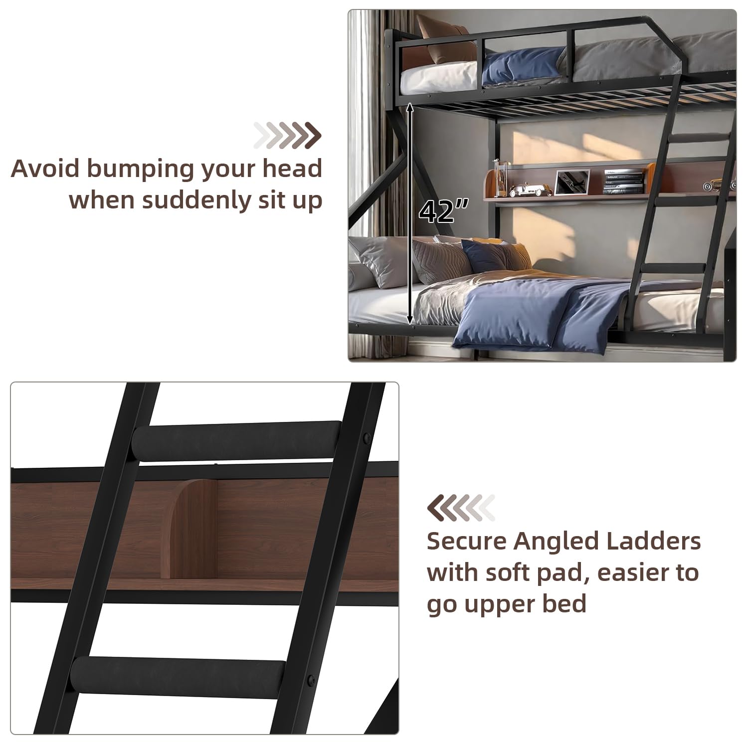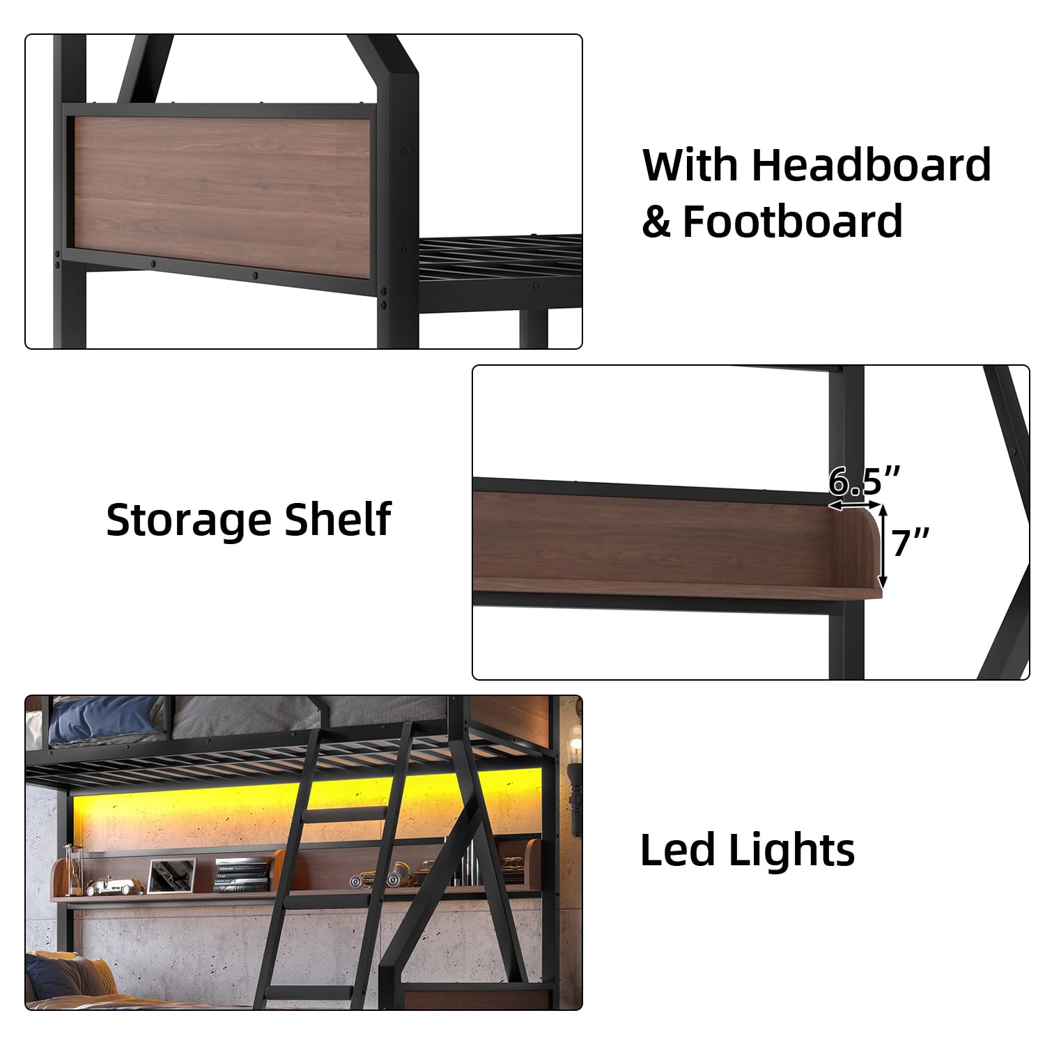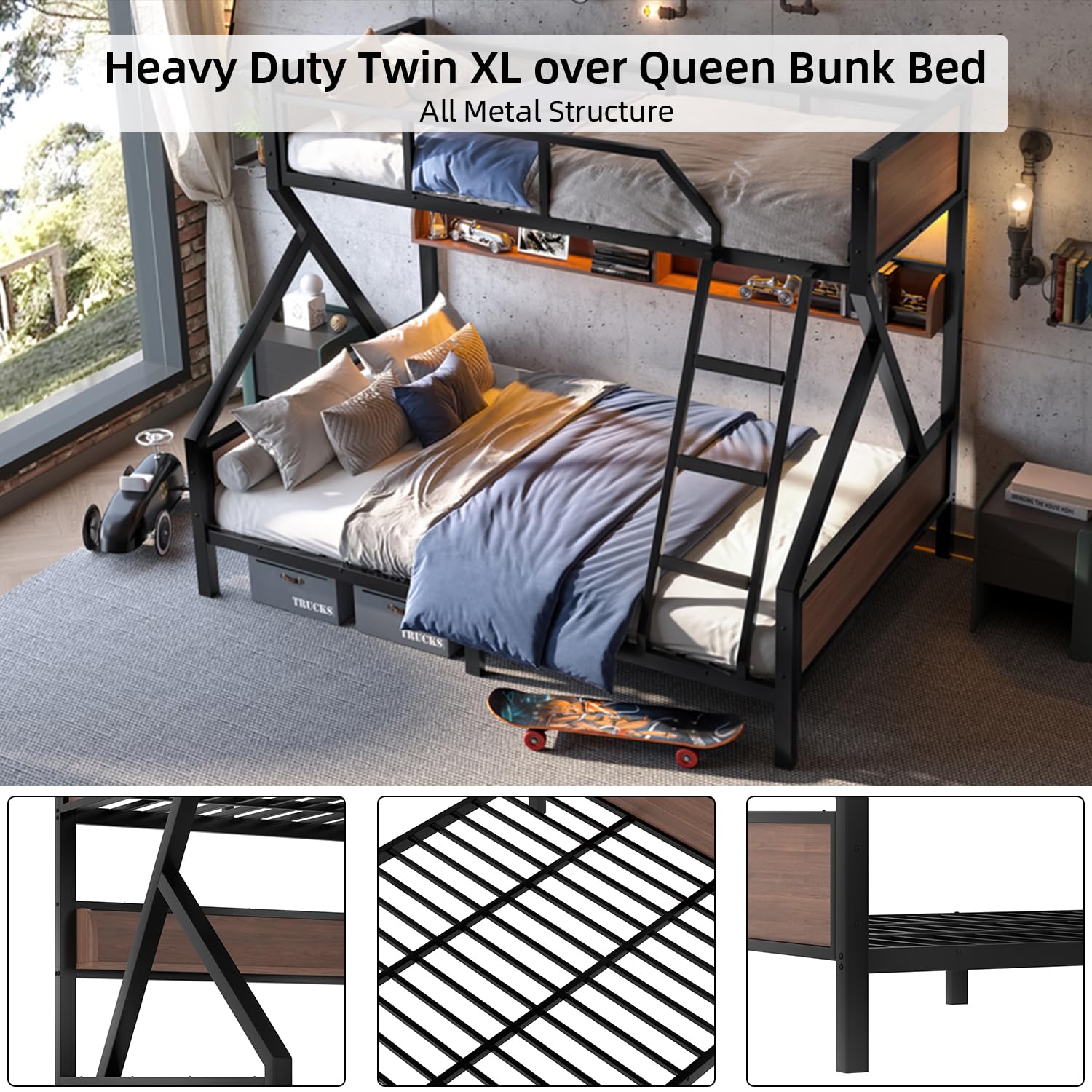 Tassullo Bunk Bed Twin XL Over Queen, Heavy Duty Metal Frame Loft Bed with Storage Shelf & LED Lights, Safety Guardrail and Angle Padded Ladder for Kids, Adults, Space Saving, Noise Free