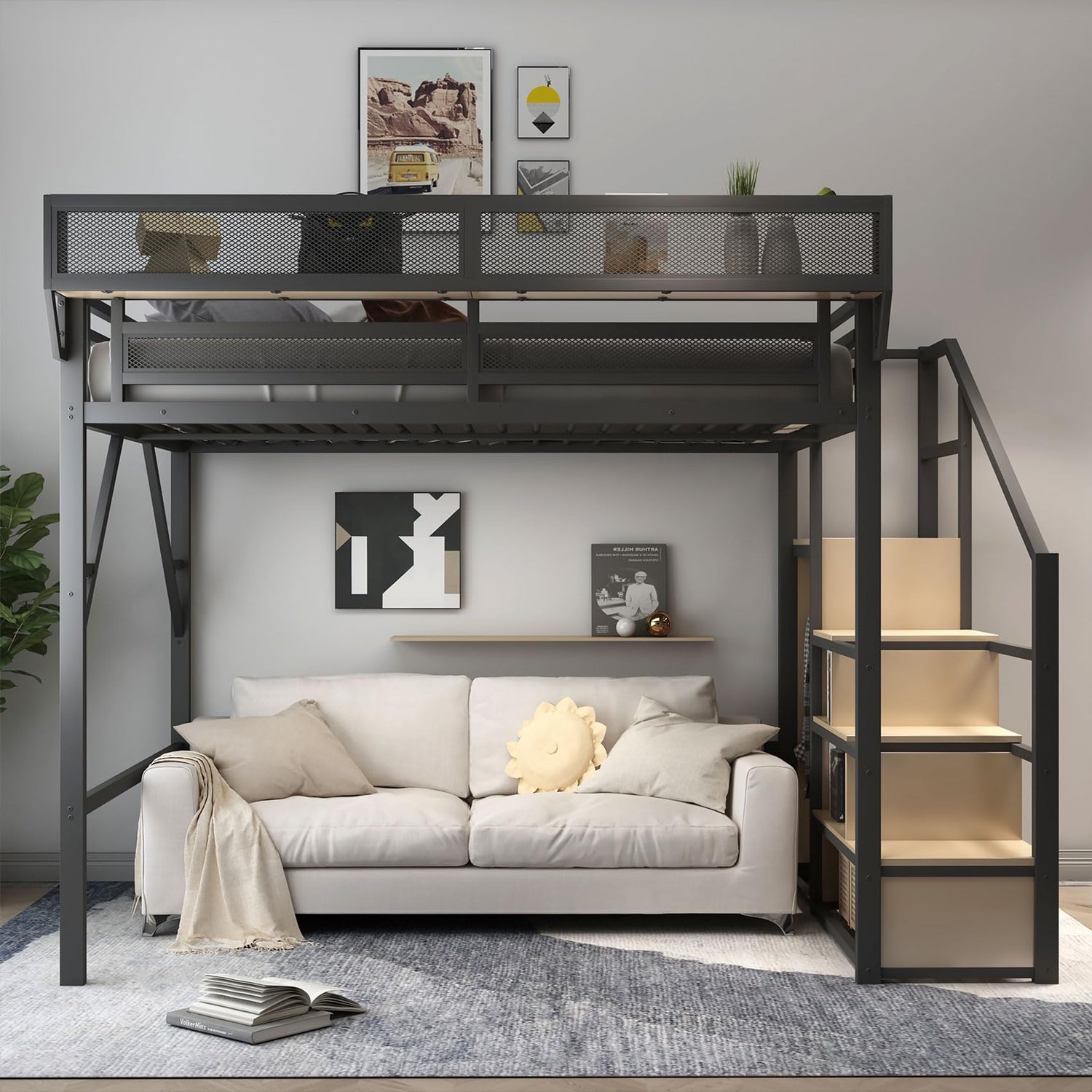 TCMILA Queen Size Metal Loft Bed with Convertible Storage Stairs and Open Wardrobe, Guardrails for Kids, Adults, Boys, Bedroom, Space-Saving, No Box Spring Needed, Black