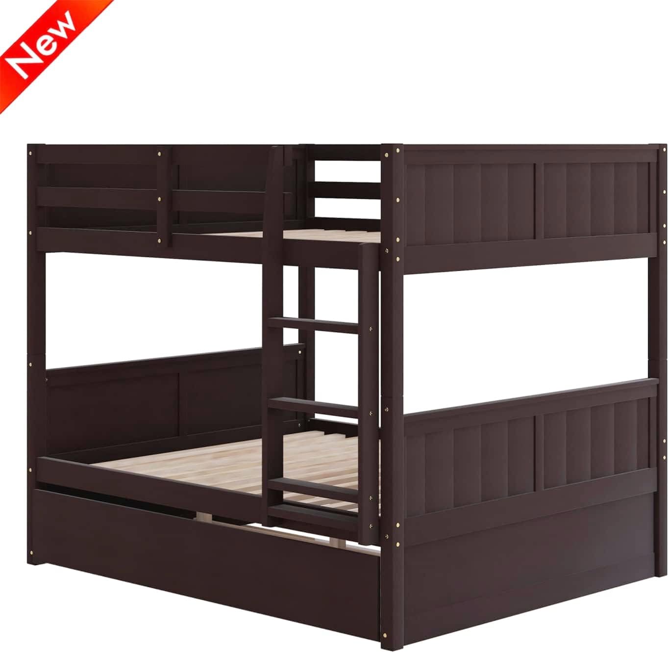 Details: Why Choose Us? Get it faster Get it faster --- If any parts are damaged or lost in the process of transportation, Just tell us, we promise to replace the parts for you. Features 1. 100% Upgraded Version & Stronger & More Stable --- Origin: Vietnam. Yes, our designers have upgraded this full over full bunk bed. Made of thickened and higher quality and grade solid wood pine and higher strength MDF wood. More stable and won't shake. Thickened and reinforced guardrails and ladder will also give you more security. 2. 100% Greater Weight Capacity & Safer & More Corrosion Resistant --- Thickened solid legs and a higher density slat system and 3 additional central support legs combine perfectly to give you greater weight capacity and safety. Number of Slats: 14+14+7. Weight Capacity: Upper bed: up to 500 pounds, bottom bed: up to 800 pounds, Trundle: up to 400 pounds. In addition, the surface is coated with a higher quality, more environmentally friendly anti-corrosion coating, making the surface less prone to cracking. 3. Convertible Design & with 1 twin size trundle --- You can easily convert this bunk bed into two separate full size beds and an easy pull out twin size trundle. The trundle is equipped with stronger casters to achieve more stable support and smoother movement. 4. Easier to Assemble --- Product Weight: 180.11 LBS. Size: 79.5"L x 57"W x 59.9"H. See pictures for details. Package Quantity: 2. Recommended Mattress Thickness: Upper bed: 6"; Bottom bed: 8"; Trundle bed: 6" (Mattress not included). You can quickly complete the assembly according to the detailed instructions.