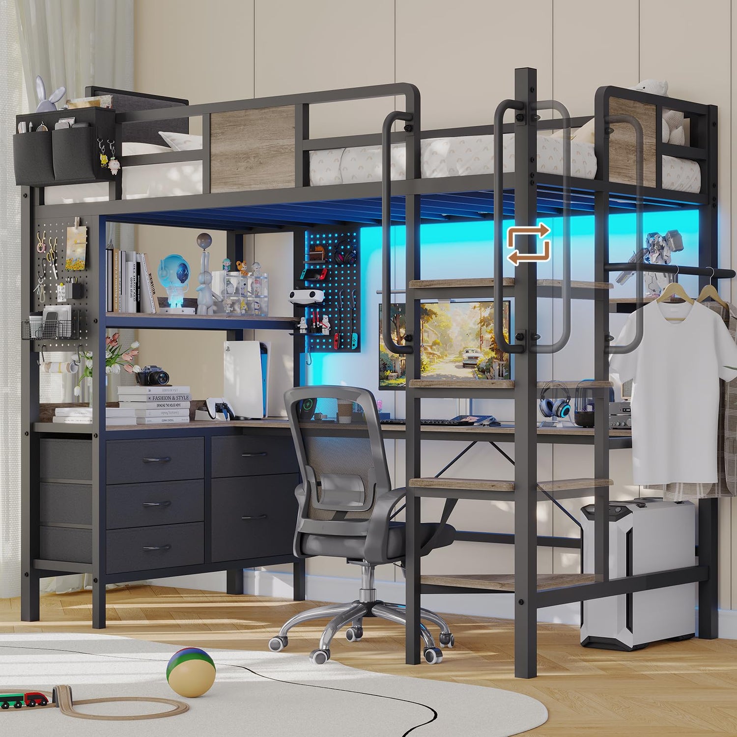 Twin Loft Bed with Desk and 5 Storage Drawers,Loft Bed Twin Size with LED Lights and Charging Station, Metal Bunk Bed Frame with Ladder, Clothes Rail,Noise Free,Oak Gray
