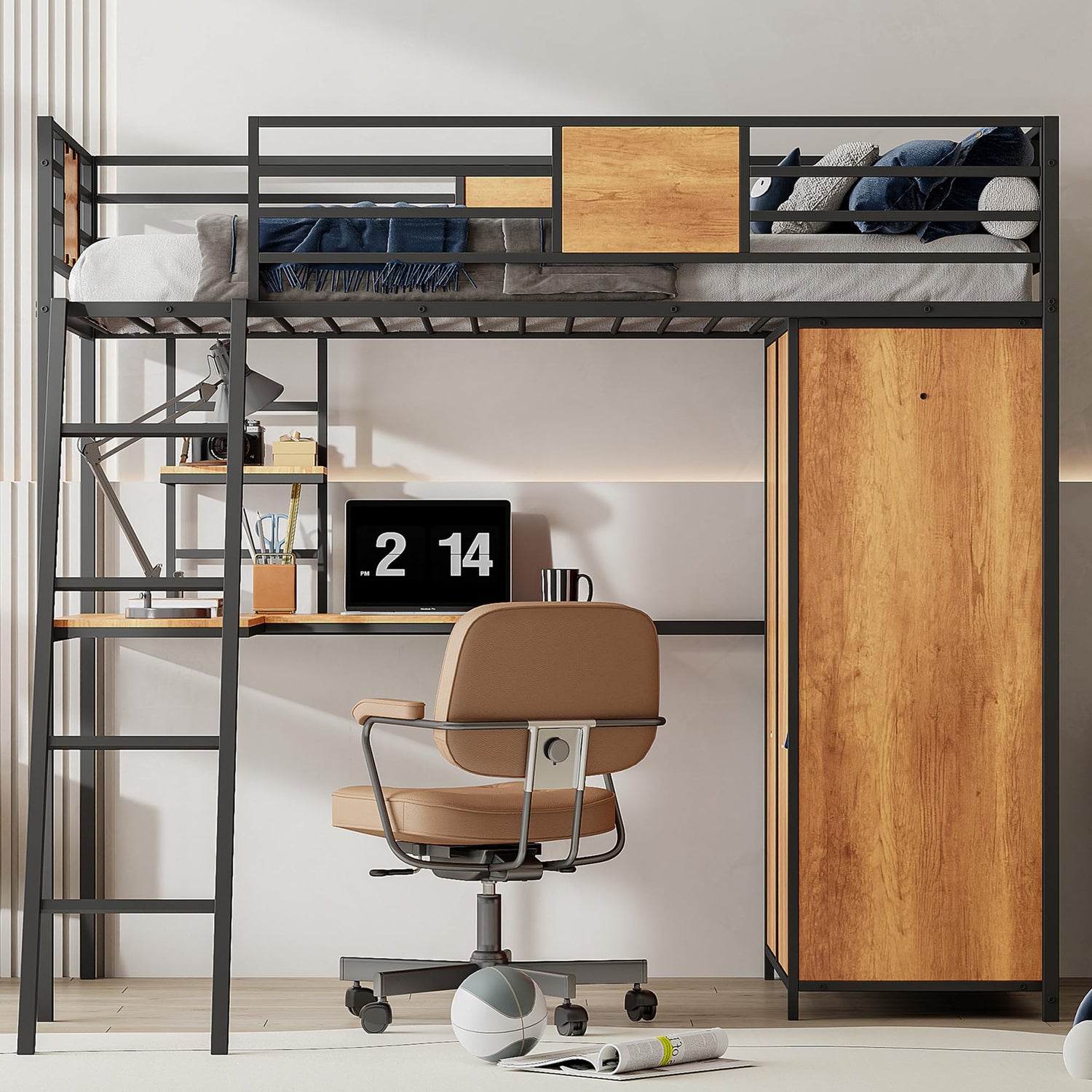 - đ„đ„ăTwin Loft Bed with Desk and Storage ShelfăThis twin loft bed combining MDF with steel, this heavy duty loft bed provides industrial style for your bedroom, suitable for any room style. The twin size loft bed comes with a L-shaped desk and shelf used for work or study where you can put some study schedules or books.