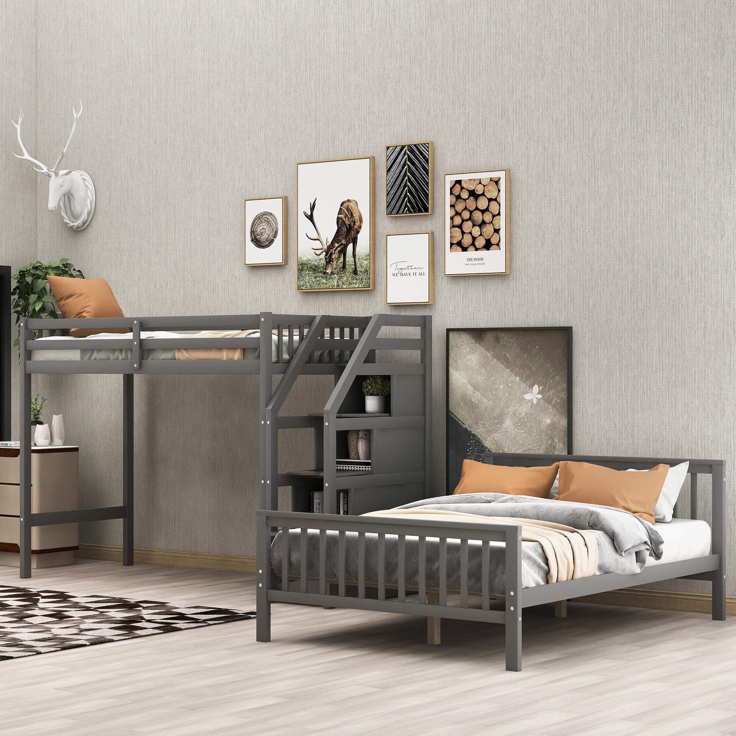 Details: Twin over Full Bunk Bed with Staircase, L-Shaped Loft Bed Frame