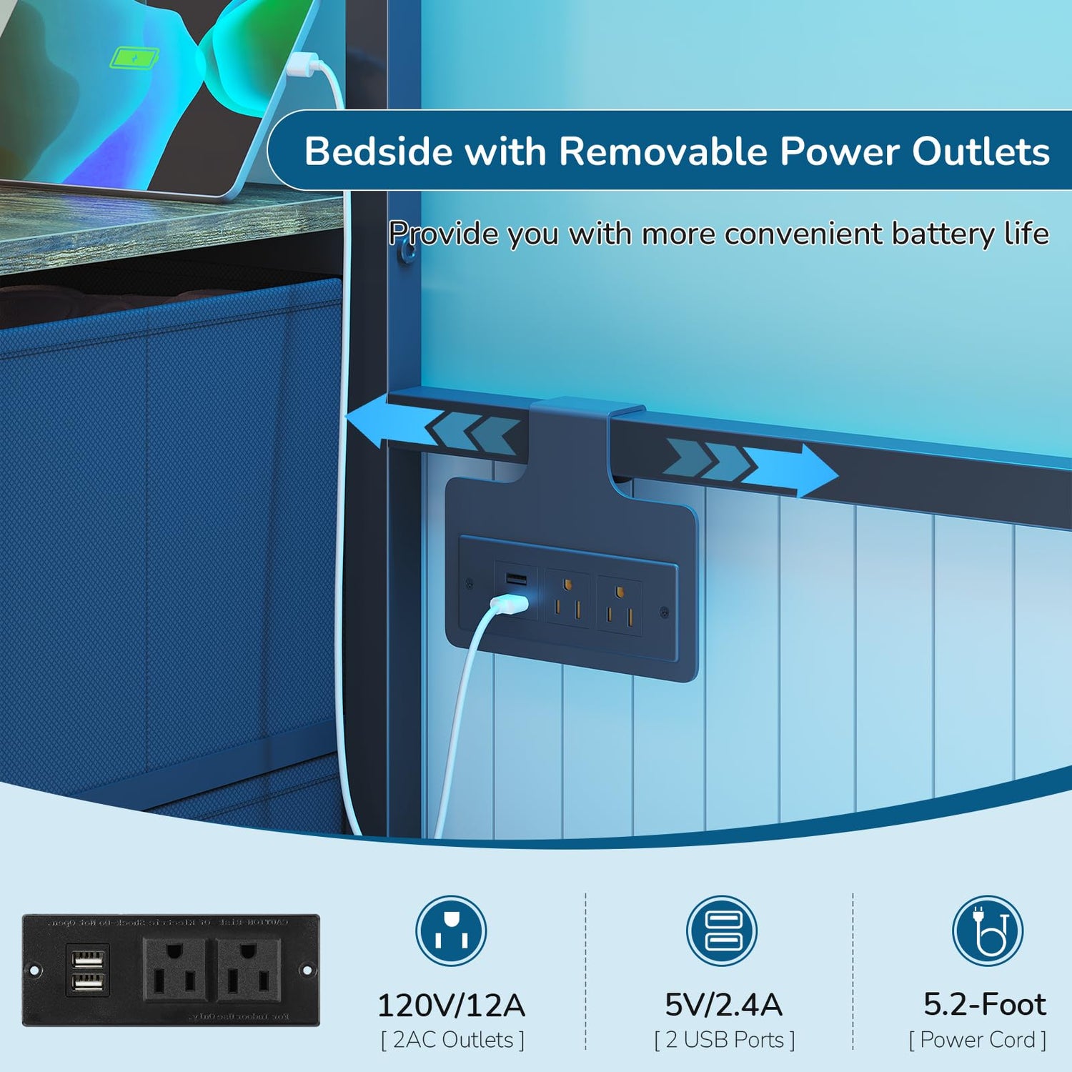 • 【Bedside with Charging Station】Movable Charging station includes 2 outlets and 2 USB Ports. Provides convenience for charging your mobile phones, iPads or other devices. Don't worry about not having enough power sockets.