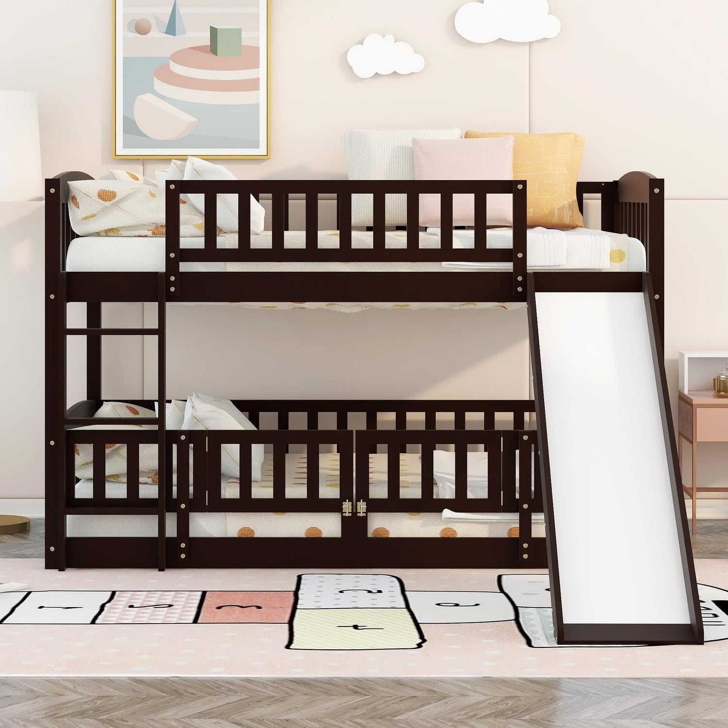 Twin Over Twin Bunk Bed with Slide for Kids, Low Bunk Bed Frame with Convertible Ladder & Detachable Fence, Solid Pine Wood Structure for Bedroom, Espresso
