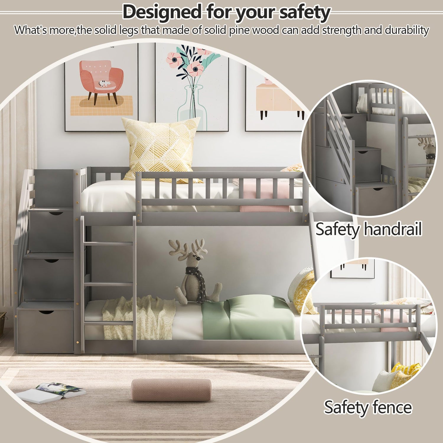 - 【Maximized Space-saving Low Bunk Beds】- Low bunk beds suit for those families who has low ceilings, and take advantage of vertical space, this twin-over-twin bunk bed can save plenty of room for you to place other furniture in kids’ bedroom. The two drawers located beneath the attached staircase provide ample storage for your little ones’ toys and bedding.