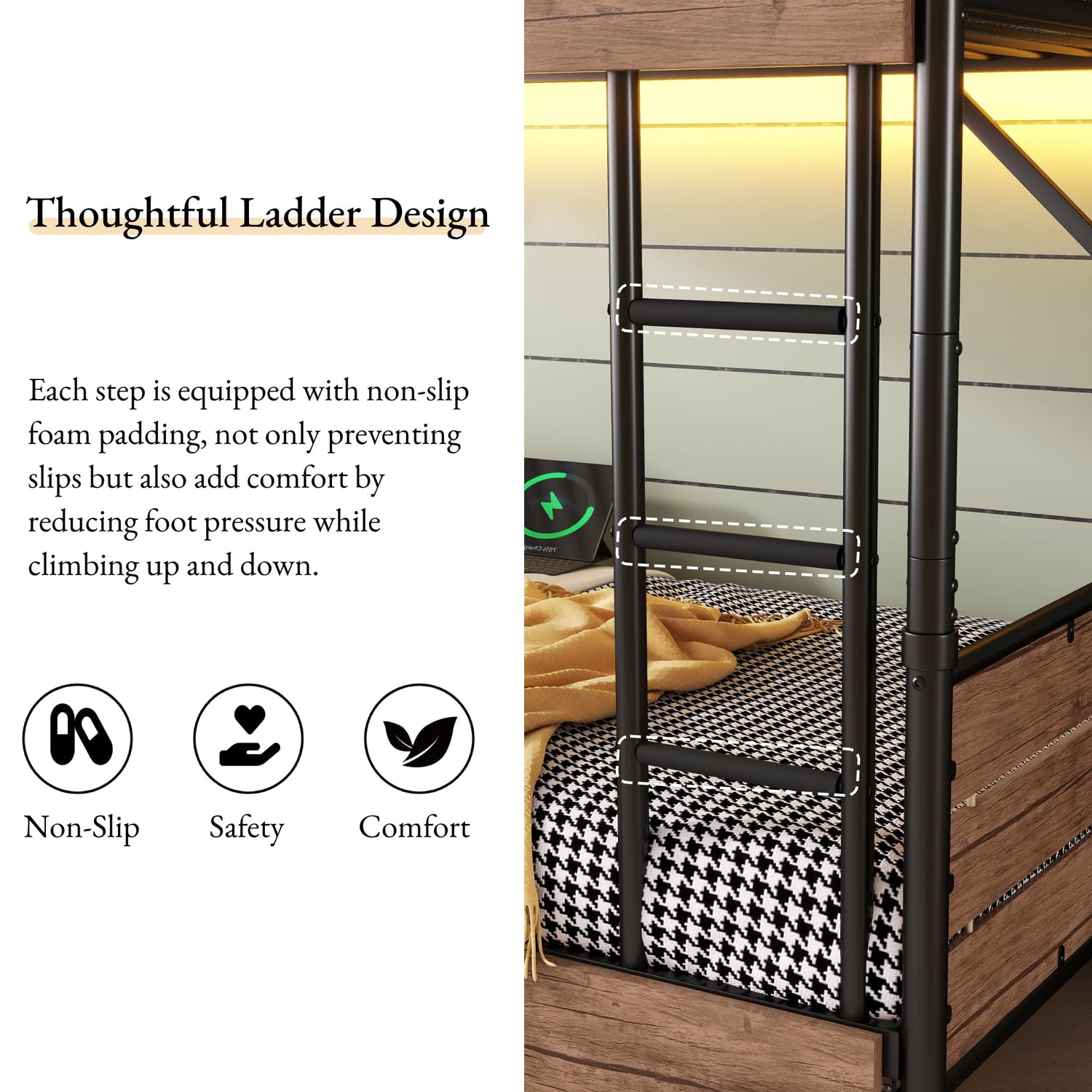 - 【Smart Lighting & Charging Hub】This metal bunk bed features app-controlled multicolor LED strips with adjustable brightness and multiple lighting modes, control via remote or smartphone app. Plus a built-in charging station (2 AC outlets + 2 USB ports) for convenient device powering.