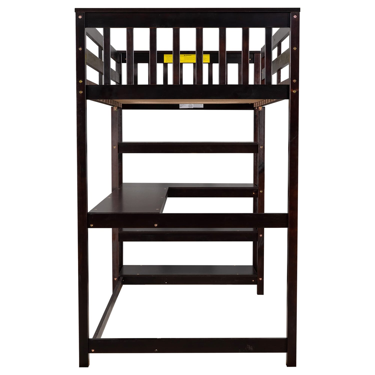 Twin Size Loft Bed with Desk & 4-Storage Shelves, Wood Loft Bed Frame with Safety Guard Rail and Under-Bed Desk, Noise Free, No Box Spring Needed, Espresso
