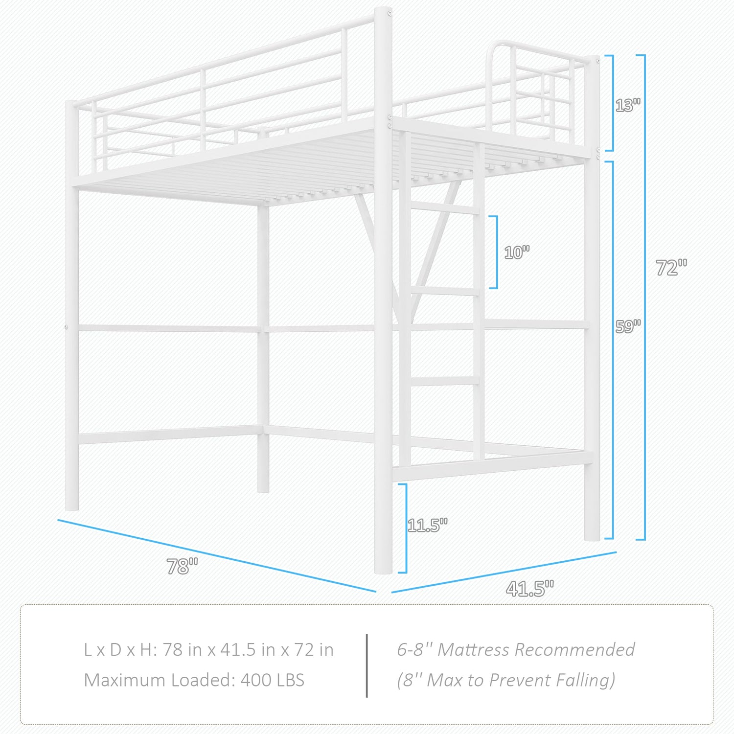 • [Maximize Space] - Elevate your living space with this twin loft bed! The multi-functional design creates a 59'' large open area underneath, perfect for a study desk, cozy reading nook, or extra storage to keep your room clutter-free.