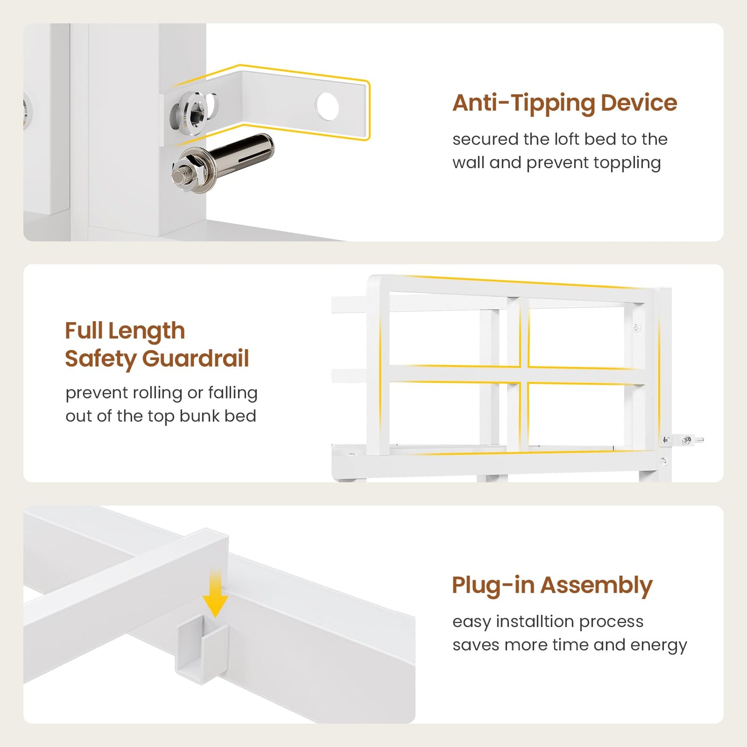 - 【🛡️Safety Engineered for Comfort】Sleep soundly & securely. The full-length guardrail on the top bunk prevents accidental rolls. The lower bunk bed features 4 non-slip mattress grippers, ensuring your mattress stays firmly in place all night long. Safety is built-in.