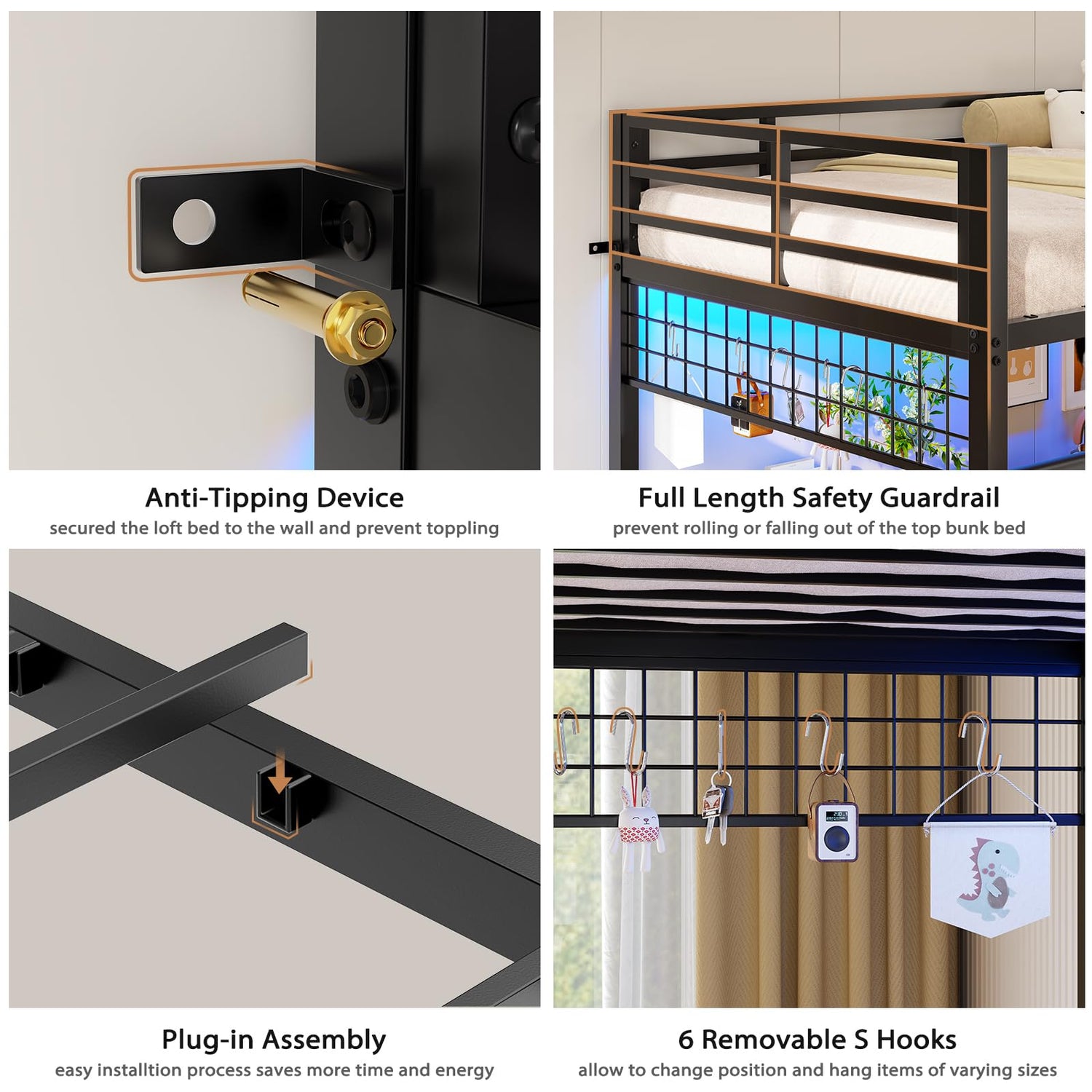 - 【Heavy Duty Metal Construction】Engineered from heavy-duty, all-steel construction, this bunk bed with storage offers rock-solid stability and durability. This twin bunk beds for kids features a robust anti-tip kit for secure wall anchoring, creating an ultra-stable fortress you can trust completely. Bubble pads on the ladder ensure safety and comfort during ascent and descent.
