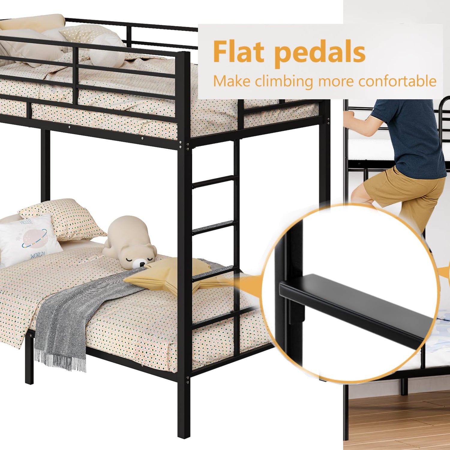 VINGLI Bunk Bed Twin Over Twin with 15 Inches Extra High Guardrail 2 Deckers Bunk Bed with Stairs & Flat Rungs, Heavy Duty Metal Slats, No Box Spring Needed, Black