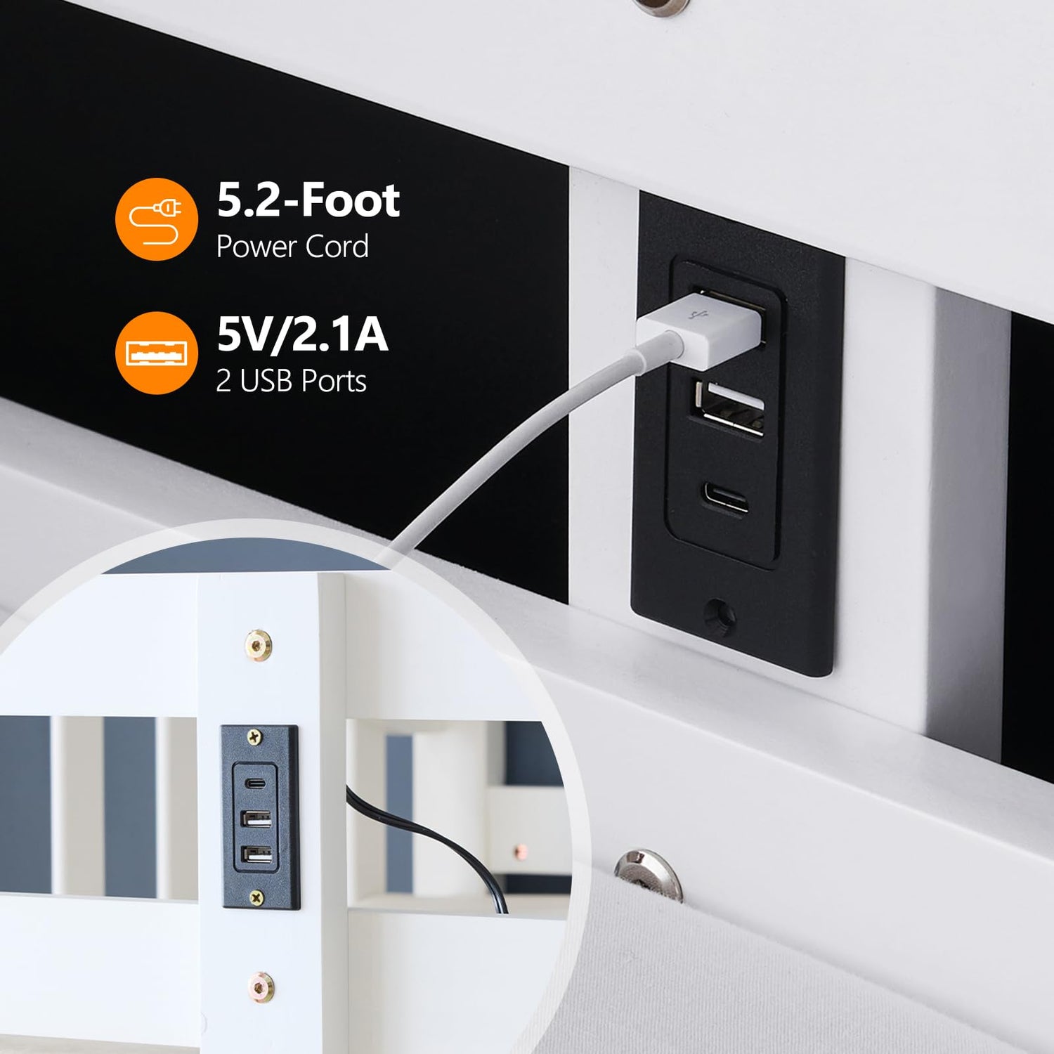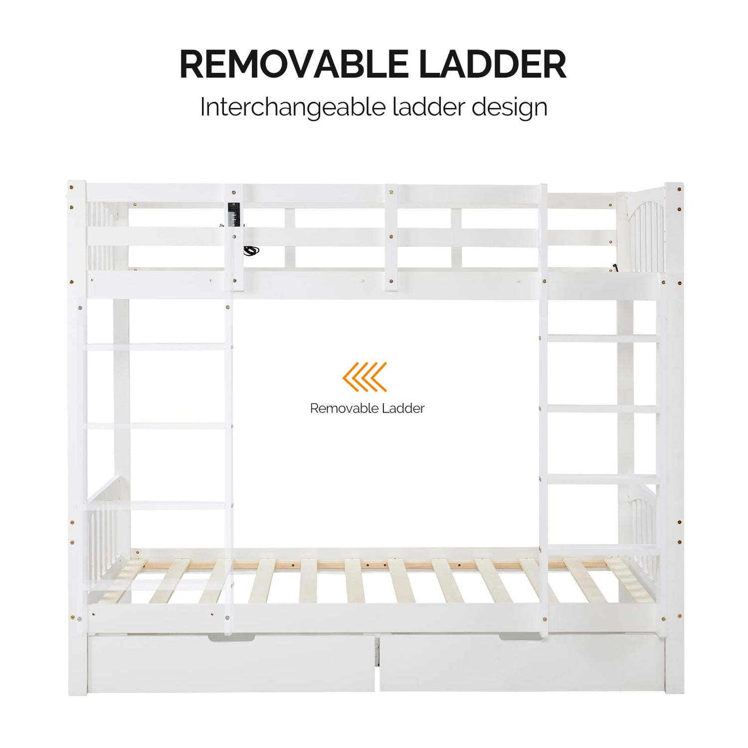 VINGLI Bunk Bed Twin Over Twin with 2 Storage Drawers/RGB LED/Charging Station, Convertible Solid Wood Bunk Bed Frame with Ladders, White