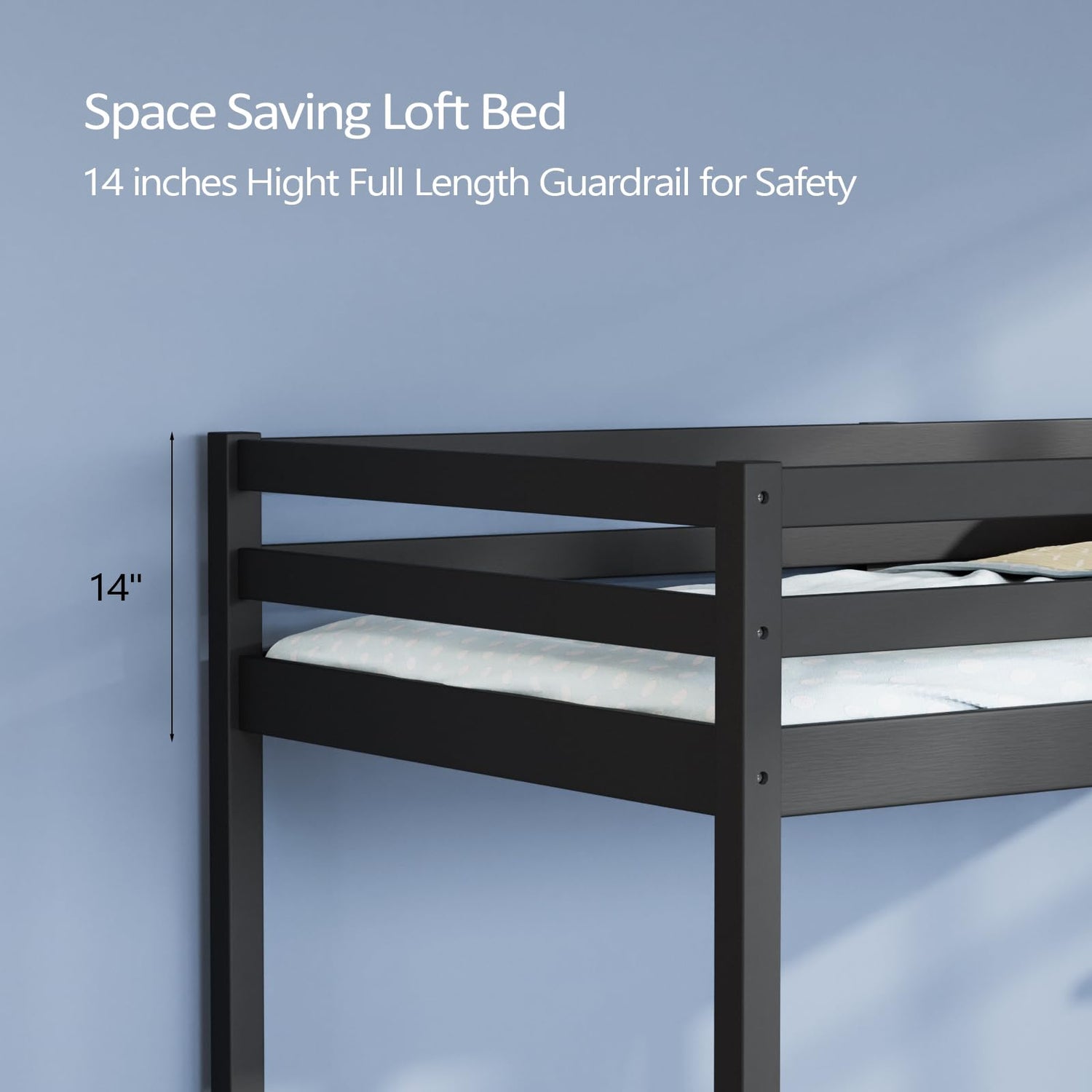• 【SOLID & STURDY BED FRAME】Constructed by 100% solid pine wood with black paint finish, this kids loft bed features 1 center beams, full-length guardrail and wood slat support, all these enhance this full loft bed load capacity to 400 LBS