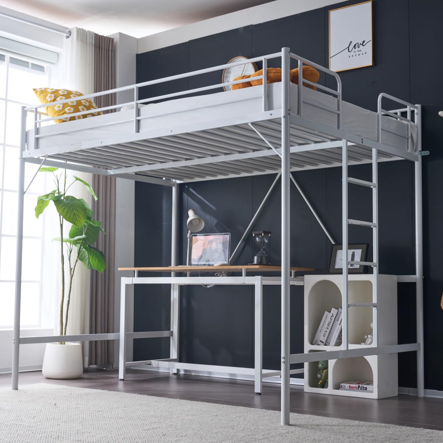 • 【Solid & Safe for a Good Night's Sleep】Built from strong 100% metal with a sleek white finish, this kids loft bed provides a secure and supportive sleeping space. Full-length guardrails offer added peace of mind, supporting up to 550 lbs.