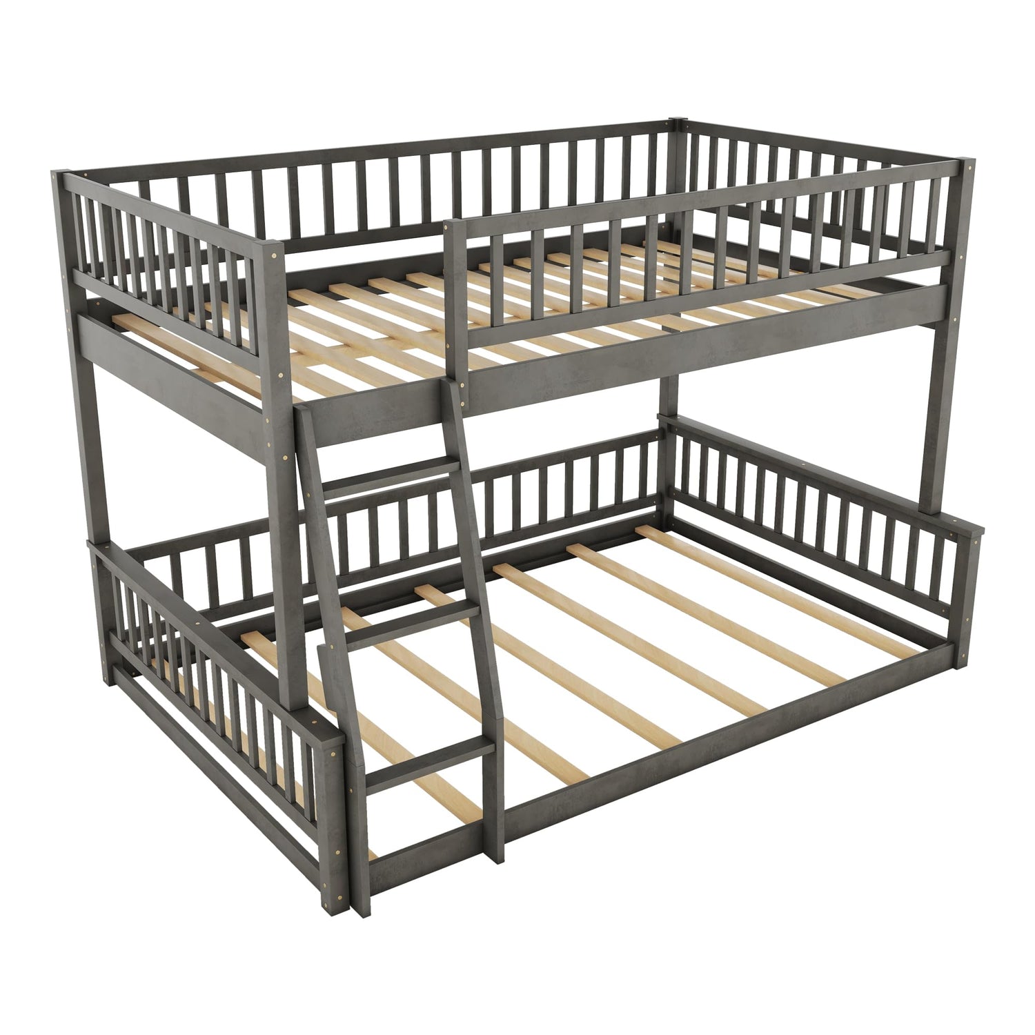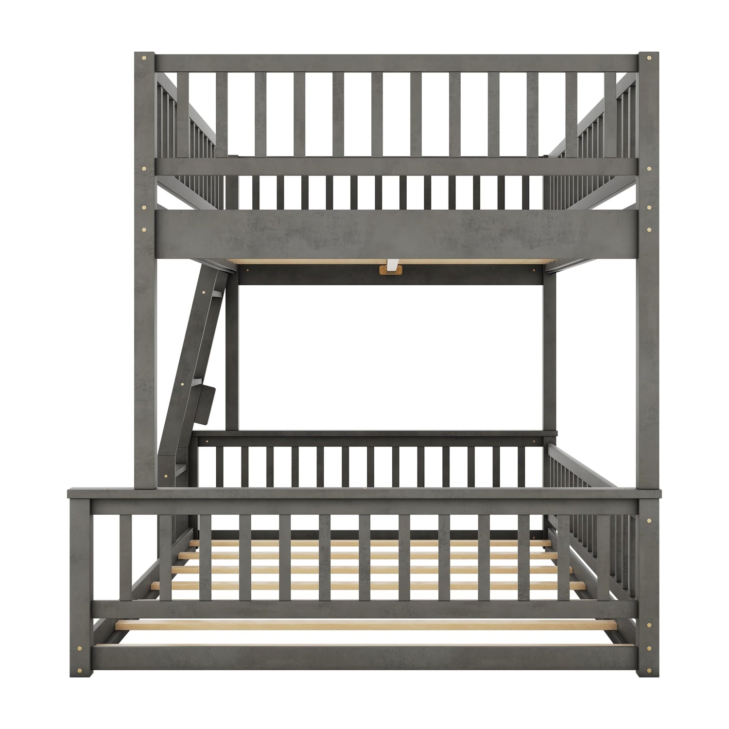 KLMM Gray Full XL Over Queen Bunk Bed with Ladder and Guardrails for Ultimate Space-Saving Style