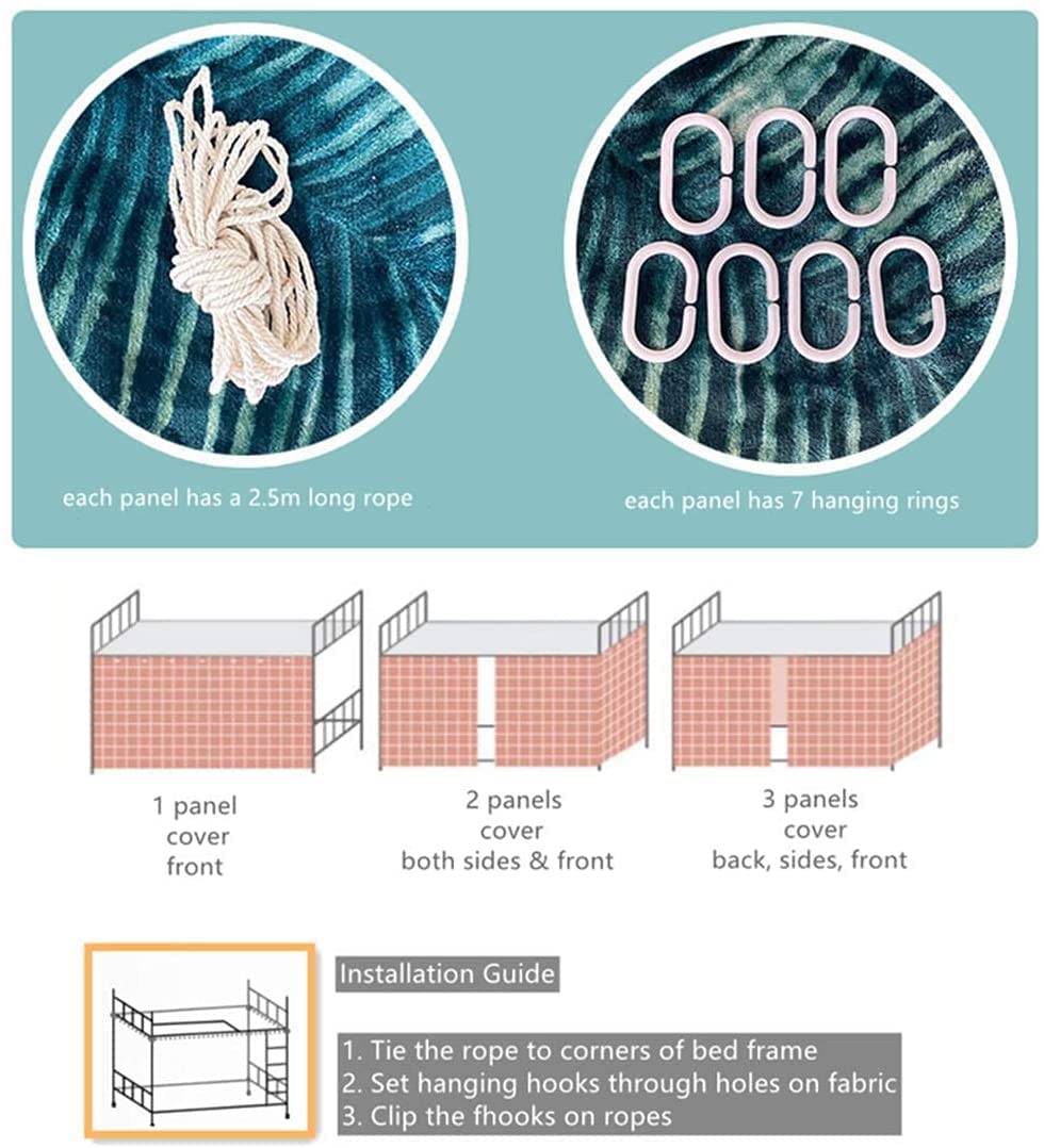Package Included: 1 set of bed curtains+hanging rope+hanging hooks