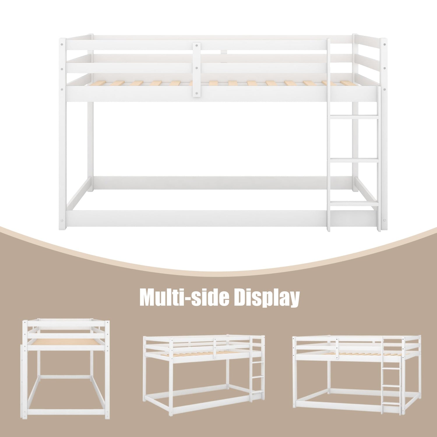 ZJIAH Twin Over Twin Low Bunk Bed with Ladder and Safety Guardrails - Durable Wooden Design in White