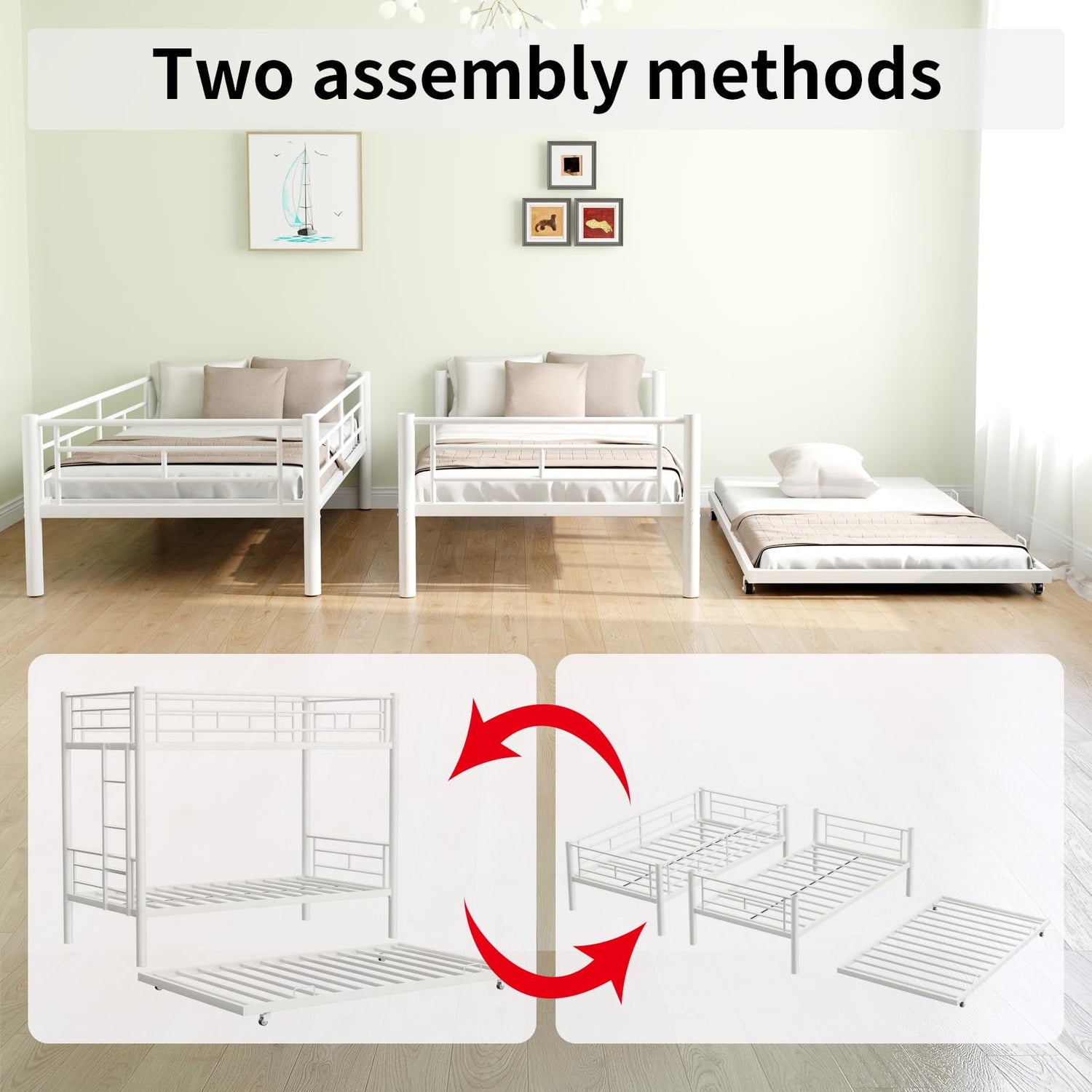 Details: Zyerch Twin Over Twin with Trundle Bunk Bed Frame,Heavy Duty Solid Metal Bunkbed with 2 Ladders and Guardrail,Convertible Bunk Beds,No Box Spring Needed Twin Over Twin Beds Frame for Adults,White