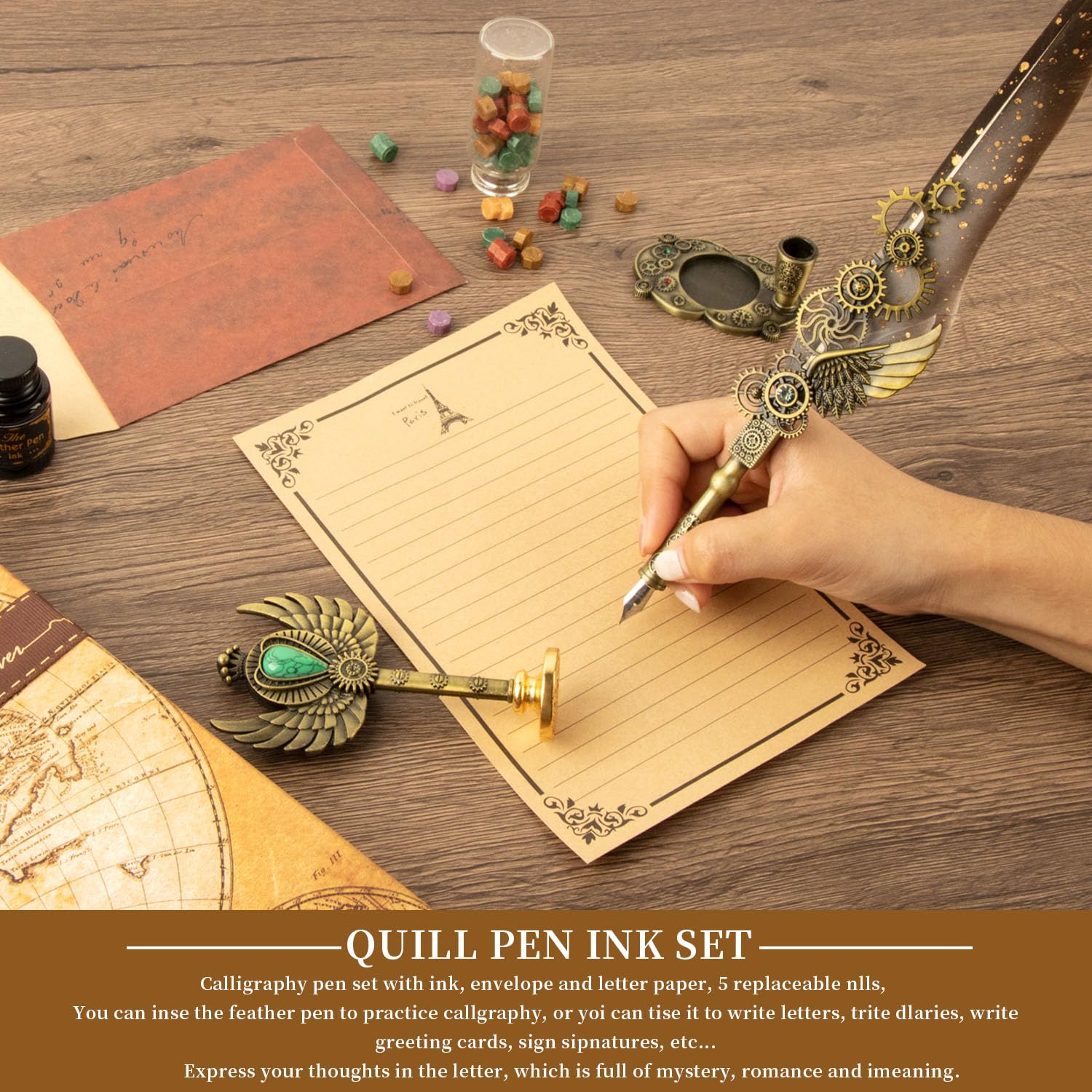 - Feather Pen Set Includes: This LongLongJin Quill Pen Ink Set includes 1* bottle of ink 5* stainless steel nibs of different sizes 1* pen holder 1* "gear design" Seal 1* envelope 1* letter paper 1*color wax beads 1*melting wax spoon and 1*white wax,It provides everything you need to create beautiful calligraphy.