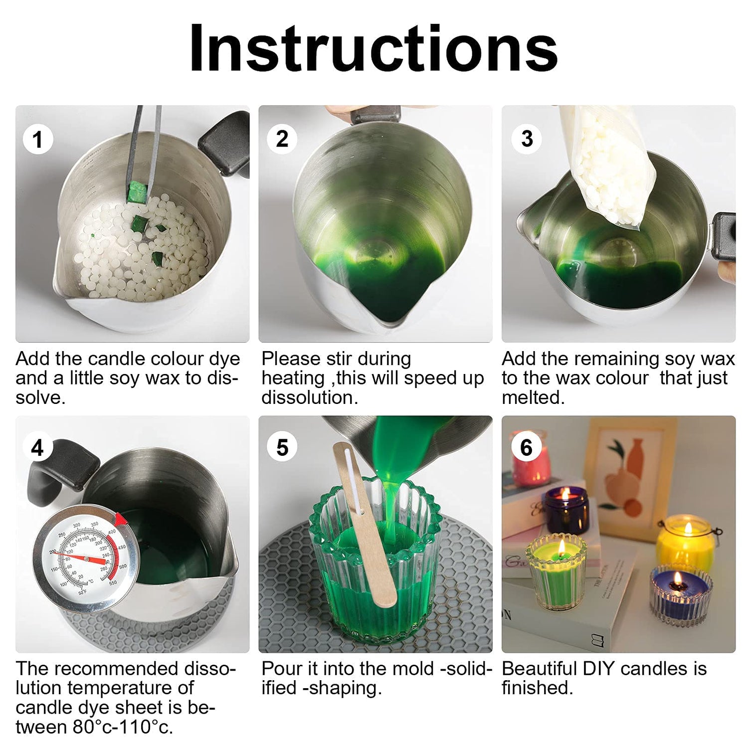 - 【Instructions】1: Add a little candle dye sheet and wax to dissolve, heated to 90 - 110 °C/195-230 ℉( recommended dissolution temperature of candle dye sheet). 2: Please stir during heating, this will speed up dissolution. 3: Until the candle dye sheet is completely dissolved, then add the remaining wax to dissolve.
