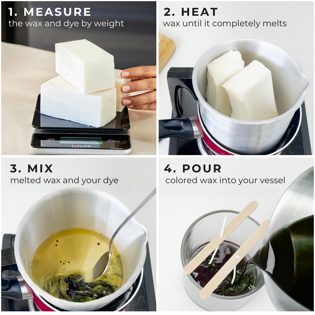 - HIGH CONCENTRATION: Just a pinch of our dye is necessary to provide rich color to the finish of your candle. Refer to the table on the product for recommended doses for each candle wax type.