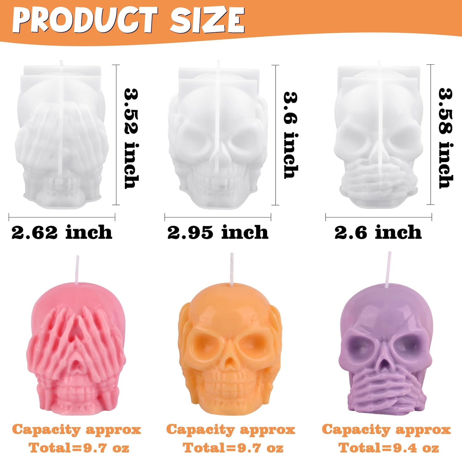HUAKENER 3 Pack Skull Candle Molds, 3D Skull Resin Molds, Hear-no, Speak-no, See-no Skull Silicone Molds for Candle, Epoxy Resin, Soap, Halloween Cake Decor