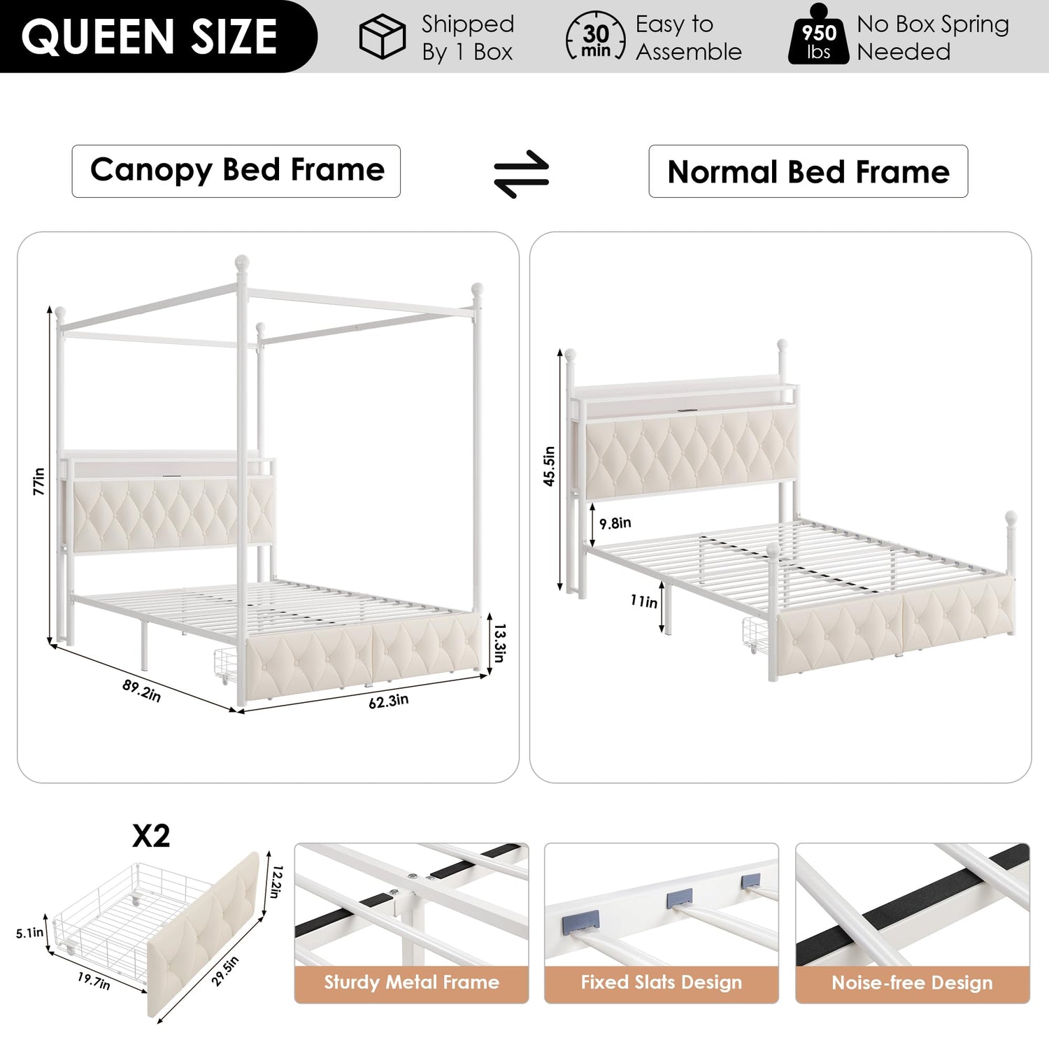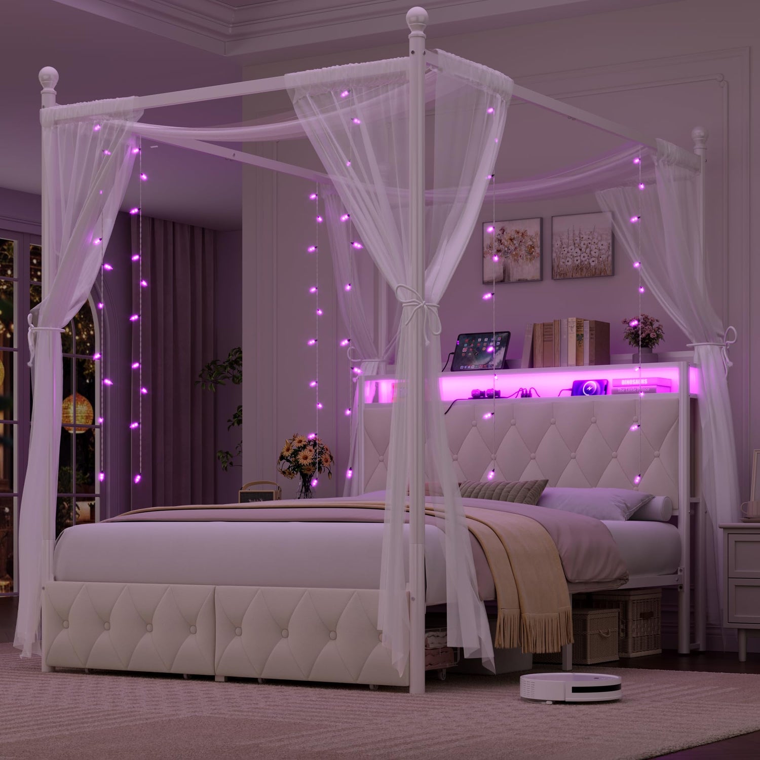 HIFIT Queen Size Upholstered LED Canopy Bed Frame with Storage and Charging Station, Button Tufted Storage Headboard with Bookshelf, Two-Use Metal Platform Bed with 4 Removable Post & 2 Drawers, Biege