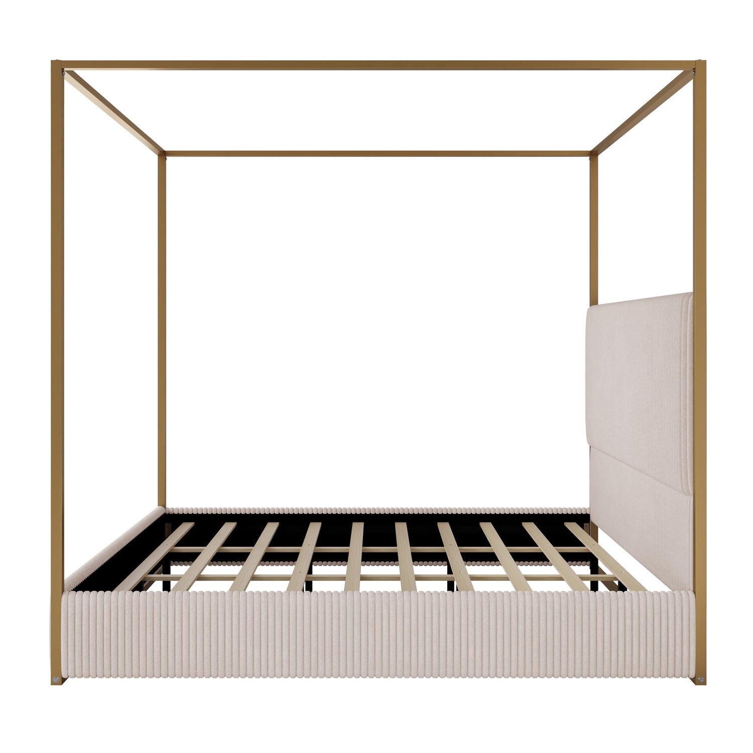King Size Metal Canopy Bed with Tall Upholstered Channel Headboard and Gold 4 Poster, No Box Spring Needed (Beige+Gold, King)