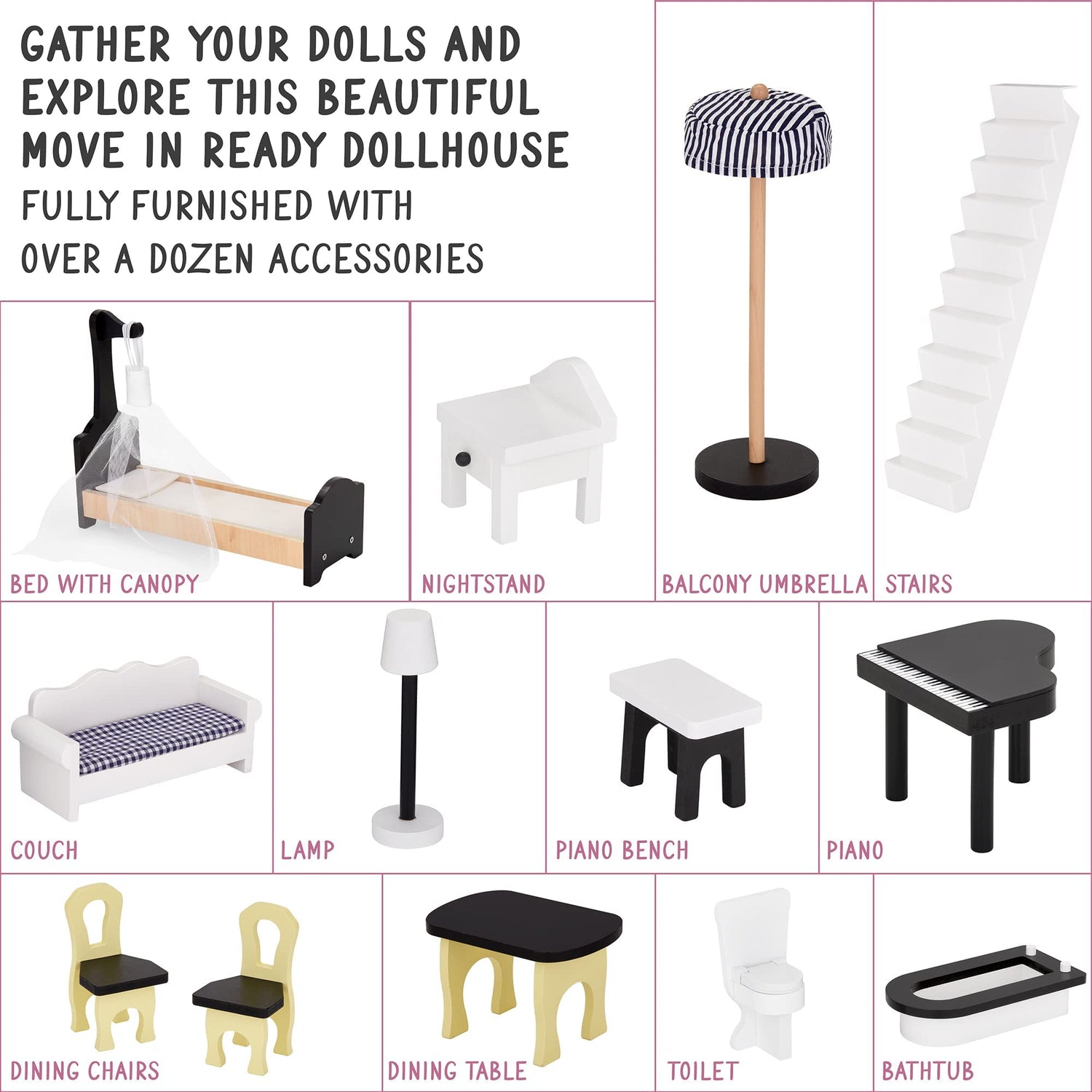 Lil' Jumbl X-Large 3-Story Wooden Dollhouse with Elevator, Balcony & Furniture Set