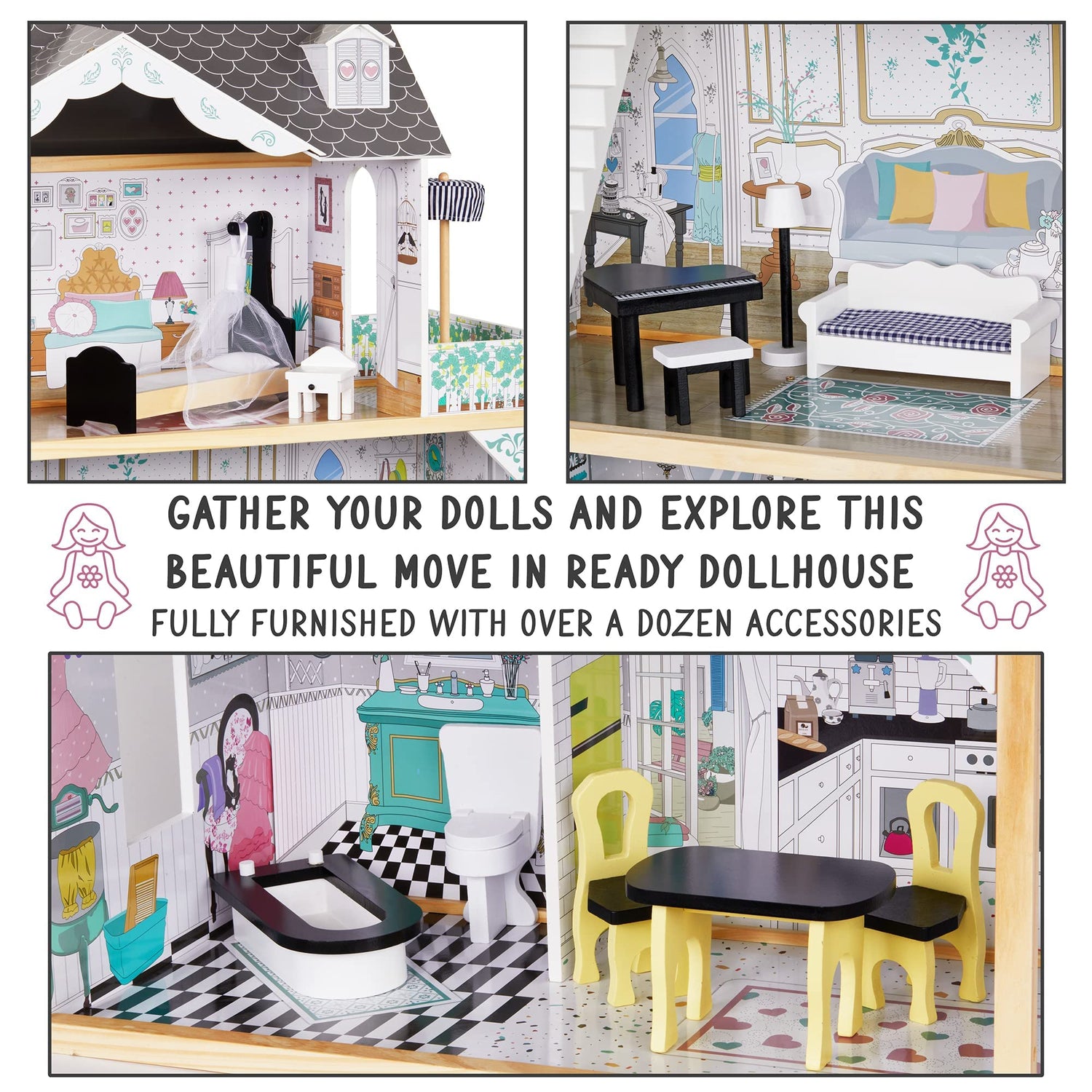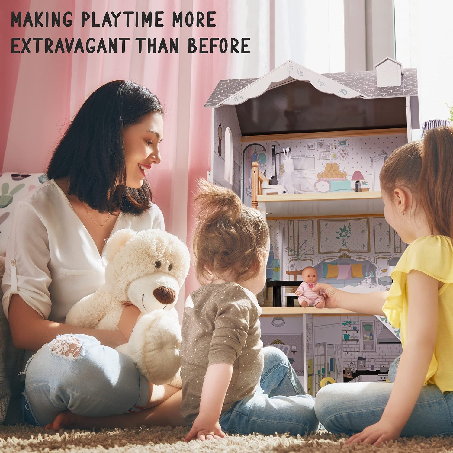 Crafted with care, this wooden dollhouse stands out for its heirloom-quality construction. Unlike flimsy cardboard competitors, it combines solid pinewood, plywood, MDF, and fabric materials to deliver durable and lightweight performance. The freestanding design ensures easy eye-level access for kids while making it a stunning addition to any room, resembling a piece of elegant furniture.