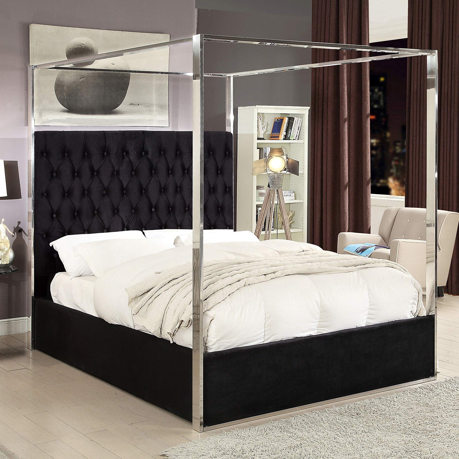 Details: Dream big in the Porter black velvet canopy bed. This handsome Meridian Furniture bed has a tufted headboard that stands a full 60 inches tall, giving the bed a regal and sophisticated look. The headboard is tufted for added elegance, and the bed comes with a chrome canopy, adding to its overall elegance and grandeur. Black velvet fabric used on the sides and headboard gives it a luxe vibe, and the headboard is heavily padded, making it an ideal backrest for reading or watching TV.
